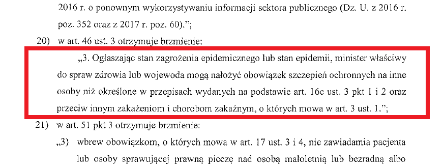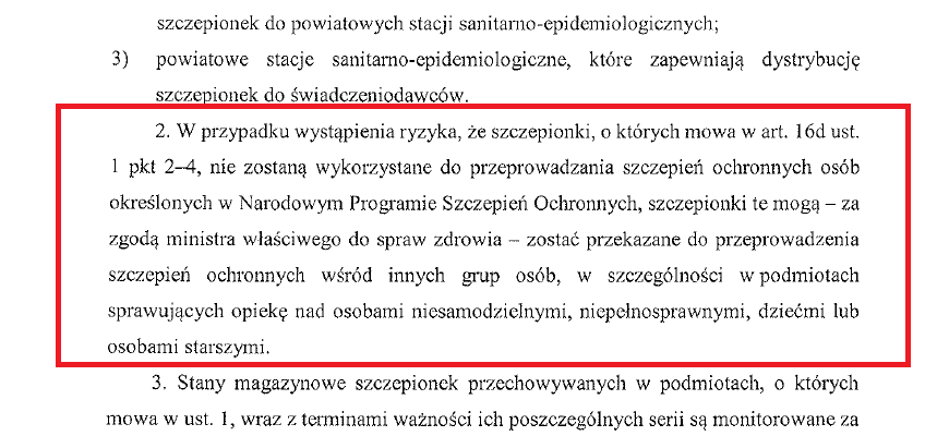 Czy ja dobrze rozumiem, że szczepionki, których nie uda Wam się przymusowo wstrzyknąć obywatelom świadomym swoich praw i potrafiącym się bronić przed rządem zlobbowanym przez komercyjne firmy produkujące szczepionki i lekarstwa, które leczą choroby wywołane tymi szczepionkami, będą mogły na mocy tej ustawy zostać w praktyce bez żadnej kontroli wstrzyknięte osobom upośledzonym, osobom w domach starców, lub dzieciom w domach dziecka? (art. 16e)