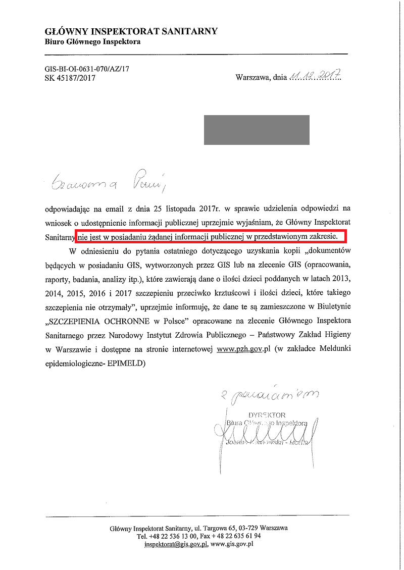 „Równocześnie uprzejmie informuję, że Główny Inspektorat Sanitarny nie znajduje się w posiadaniu dokumentów („opracowań”, „raportów”, „badań” i „analiz”), o których udostępnienie zwracają się Państwo w kolejnych punktach od pkt. 1 do pkt. 6 maila stanowiącego wniosek o udostępnienie informacji publicznej. Główny Inspektorat Sanitarny nie posiada, jak również nie zlecał, nie zamawiał i nie wytwarzał dokumentów o określonym w mailu przedmiocie, zakresie spraw lub treści. „
