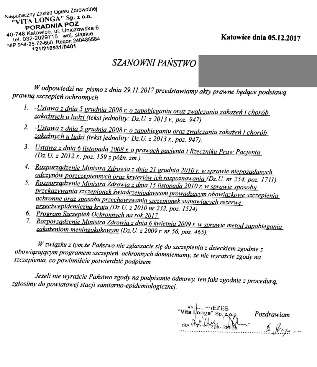 W piśmie tym pytaliśmy np. z jakich badań naukowych wynika, że podanie dziecku szczepionki oznacza bezwarunkowe zyskanie odporności każdego zaszczepionego dziecka na całe jego życie. No bo skoro nie ma szczepień przypusowych dla dorosłych, to znaczy, że zakładamy dożywotnią odporność.