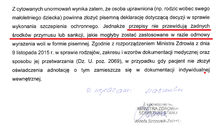Tymczasem zabieg szczepienia w ramach obowiązkowego Programu Szczepień Ochronnych jest – jako zabieg obowiązkowy – zabiegiem o wyjątkowym charakterze. Odmowa poddania dziecka szczepieniom ochronnym może prowadzić do nałożenia przez Aparat Urzędniczy Państwa Polskiego na rodziców dziecka dotkliwych kar finansowych w celu nakłonienia ich do podjęcia ustawowego obowiązku szczepień ochronnych.
