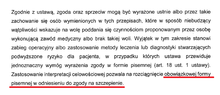 Skoro więc osoba podlegająca obowiązkowym szczepieniom ochronnym jest zobowiązana poddać się szczepieniu, to prawo powinno jej umożliwić wyrażenie dobrowolnej zgody na obowiązkowy zabieg szczepienia dopiero po uzyskaniu wyczerpujących informacji nie tylko o możliwych korzyściach płynących z obowiązkowych szczepień ochronnych, ale także o możliwych negatywnych następstwach obowiązkowego zabiegu szczepienia.