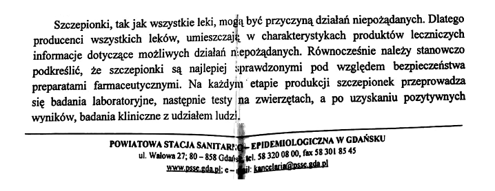 - o możliwych niepożądanych reakcjach organizmu po podaniu szczepionki, których wystąpienia nie można wykluczyć i o ich możliwych skutkach dla zdrowia lub życia osoby poddawanej obowiązkowemu szczepieniu ochronnemu, w tym także o ryzyku wystąpienia trwałego upośledzenia fizycznego bądź umysłowego oraz o ryzyku zgonu dziecka w wyniku zabiegu szczepienia;