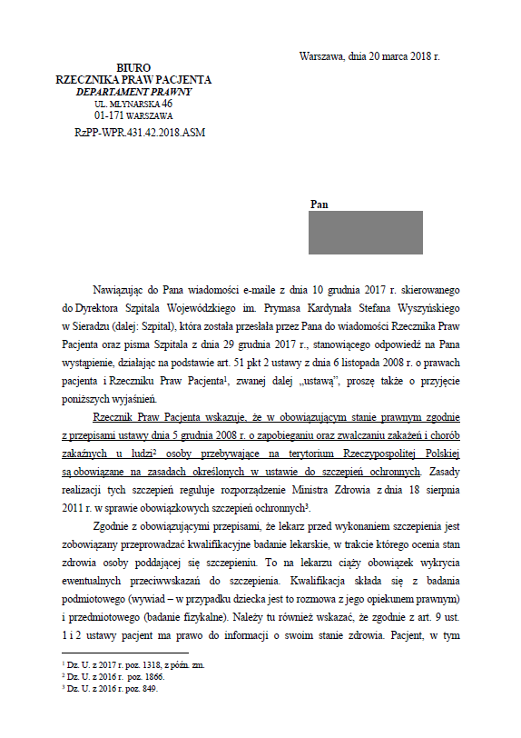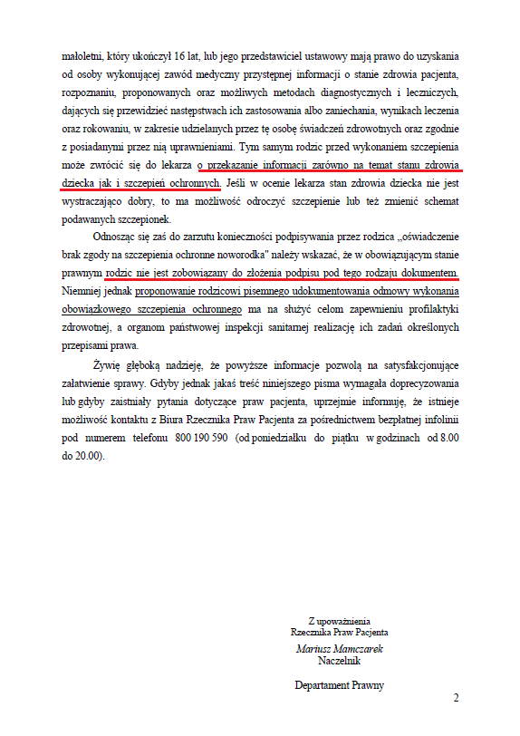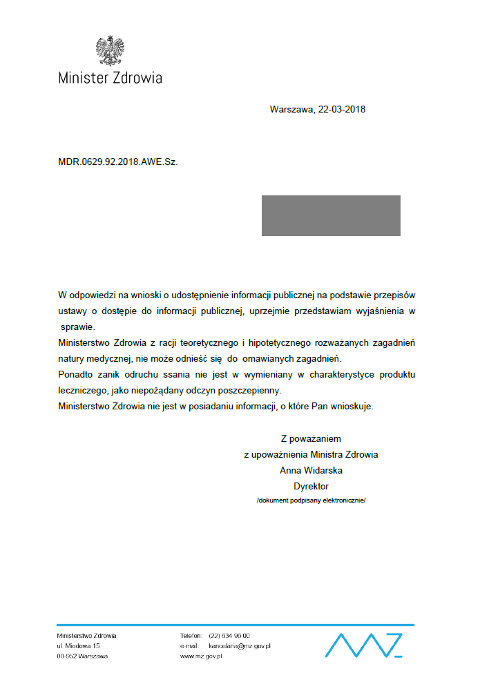 A oto niezwykle obszerna i jakże wyczerpująca odpowiedź Ministerstwa Zdrowia, które, jakby nie patrzeć, ponosi pełną odpowiedzialność za to, że niemal każdy polski noworodek w kilka godzin po urodzeniu otrzymuje domięśniowo zastrzyk ze szczepionki przeciw gruźlicy oraz ze szczepionki przeciw wirusowemu zapaleniu wątroby typu B:
