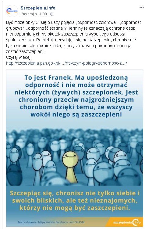 Na profilu szczepienia.info na facebooku można przeczytać historię Franka, który choć sam nie może się szczepić, to rzekomo jest bezpieczny, bo szczepią się wszyscy wokół niego.