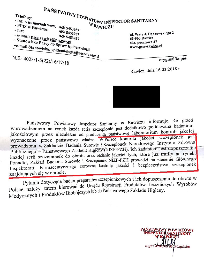 W załączeniu skan pisma sygn. N.E-4023/1-5(22)/16/17/18 z dnia 16.03.2018 , w którym PPIS w Rawiczu informuje, że Zakład Badania Surowic i Szczepionek NIZP-PZH przeprowadza kontrolę jakości szczepionek.