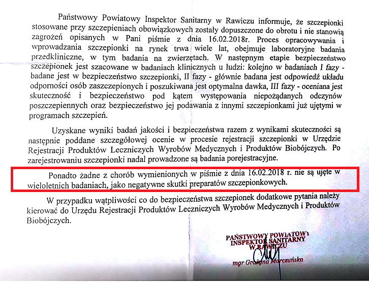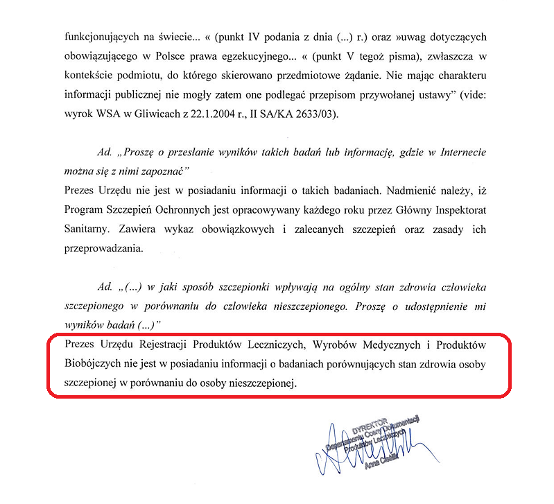 szczepionki są bezpieczne, ponieważ ani Ministerstwo Zdrowia ani Urząd Rejestracji Produktów Leczniczych nie dysponują żadnymi wynikami badań, które świadczyłyby o tym, że dzieci szczepione są zdrowsze, niż nieszczepione,