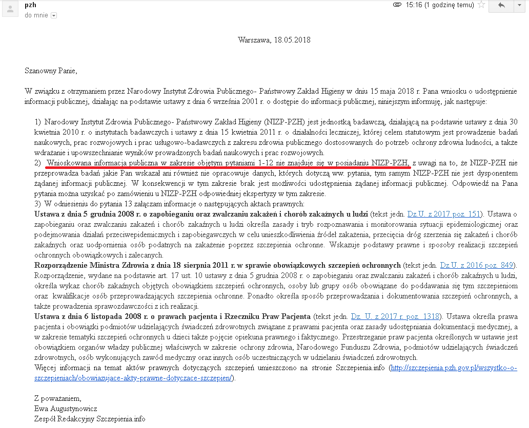 - udostępnienie wyników badań potwierdzających, że dzieci szczepione nie chorują na nowotwory częściej, niż dzieci nieszczepione, bądź wskazanie organu, który będzie władny i kompetentny udostępnić mi takie informacje, jeśli nie znajdują się one w posiadaniu PPIS.