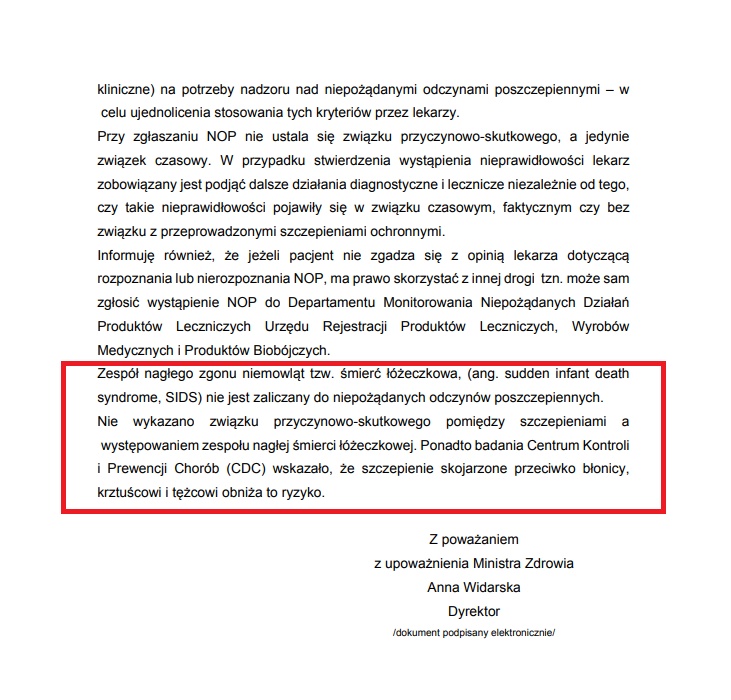 - czy w przypadku zgonu o nieustalonej przyczynie lub zgonu w postaci „śmierci łóżeczkowej”, jeśli zgon taki miał miejsce w bezpośrednim następstwie czasowym zabiegu szczepienia dziecka (do 4 tygodni od szczepienia), szczepionka, która została podana zmarłemu dziecku, jest wycofywana z obrotu do czasu wykluczenia, że bezpośrednią lub pośrednią przyczyną zgonu mogła być ta szczepionka?