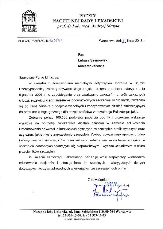 Prezes Naczelnej Izby Lekarskiej prof. dr hab. med. Andrzej Matyja przeczytał projekt StopNop wprowadzający dobrowolność szczepień i skierował do Ministra Zdrowia apel. O taki: