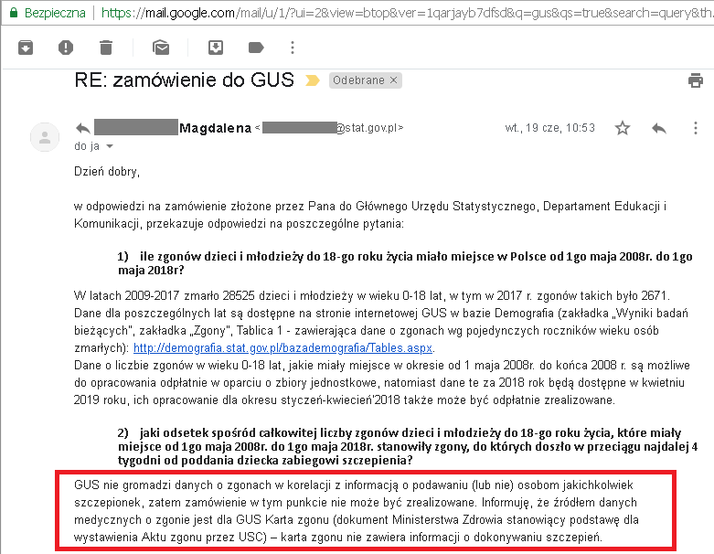 Jeśli zapytasz GUS, ile dzieci zmarło w ostatnich latach do 4 tygodni od ostatniego szczepienia, to otrzymasz taką oto odpowiedź: