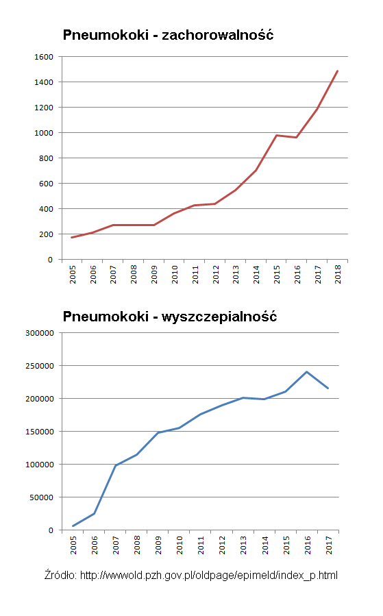 Równocześnie dane epidemiologiczne publikowane przez Państwowy Zakład Higieny wskazują na postępujący wzrost zachorowań na inwazyjną chorobę pneumokokową (IChP) niemal idealnie podążający za wzrostem wyszczepialności szczepionkami PCV. W roku 2005, gdy wprowadzano dopiero pierwsze dobrowolne szczepienia przeciw pneumokokom, zaszczepiono 6658 osób, a na IChP zachorowało wówczas 176 osób.