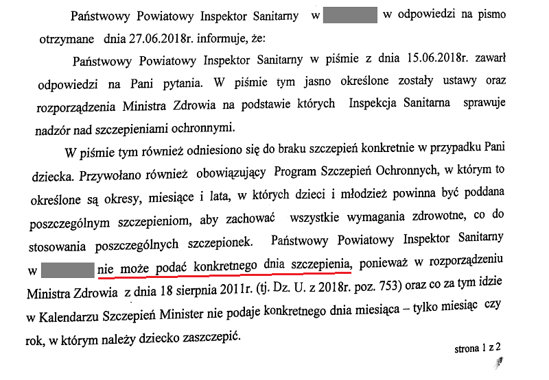 W związku z nieudzieleniem mi pismem sygn .[…] z dnia […] odpowiedzi na moje pytania zawarte w piśmie z dnia […] niniejszym ponownie wzywam PPIS w […] do wskazania daty, wraz z którą w ocenie PPIS w […] upłynął termin wykonania szczepień ochronnych mojego dziecka.