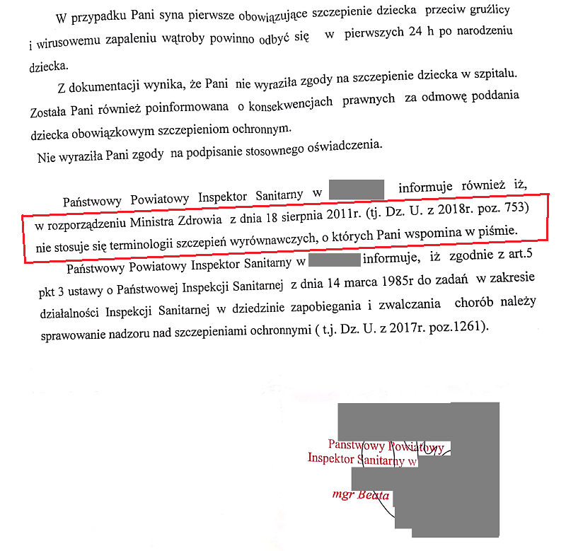 A więc pomimo że w rozporządzeniu w sprawie obowiązkowych szczepień ochronnych nie została podana data pierwszego szczepienia dziecka przeciw gruźlicy i WZW B, to sanepid odwołuje się do kalendarza szczepień, który ZALECA aby te szczepienia wykonać w pierwszej dobie życia dziecka. Ale jeśli rodzice odwołują się do kalendarza szczepień, wskazując, że ich dziecko obecnie znajduje się przecież na etapie „szczepień wyrównawczych”, a więc nie można już od nich wymagać, aby dziecko zostało zaszczepione przeciw gruźlicy i WZW B w pierwszej dobie, to nagle okazuje się, że „szczepienia wyrównawcze” to termin zupełnie nieistotny, bo przecież w rozporządzeniu Ministra Zdrowia w sprawie obowiązkowych szczepień ochronnych „nie stosuje się terminologii szczepień wyrównawczych”.