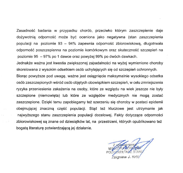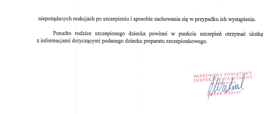 Informuję, że monitorowanie niepożądanych odczynów poszczepiennych jest w Polsce prowadzone zgodnie z Rozporządzeniem Ministra Zdrowia z dnia 21 grudnia 2010 r. w sprawie niepożądanych odczynów poszczepiennych oraz kryteriów ich rozpoznawania (Dz.U. 2010 nr 254 poz. 1711), zgodnie z którym lekarz lub felczer jest zobowiązany do zgłoszenia rozpoznanego lub podejrzewanego niepożądanego odczynu poszczepiennego. W uzupełnieniu wyjaśniam, że odpowiedź na pytanie czy szczepionki mogą wywoływać zespół nagłego zgonu niemowląt dostępna jest na stronie NIZP-PZH pod adresem: http://szczepienia.pzh.gov.pl/najczesciej-zadawane-pytania/.
