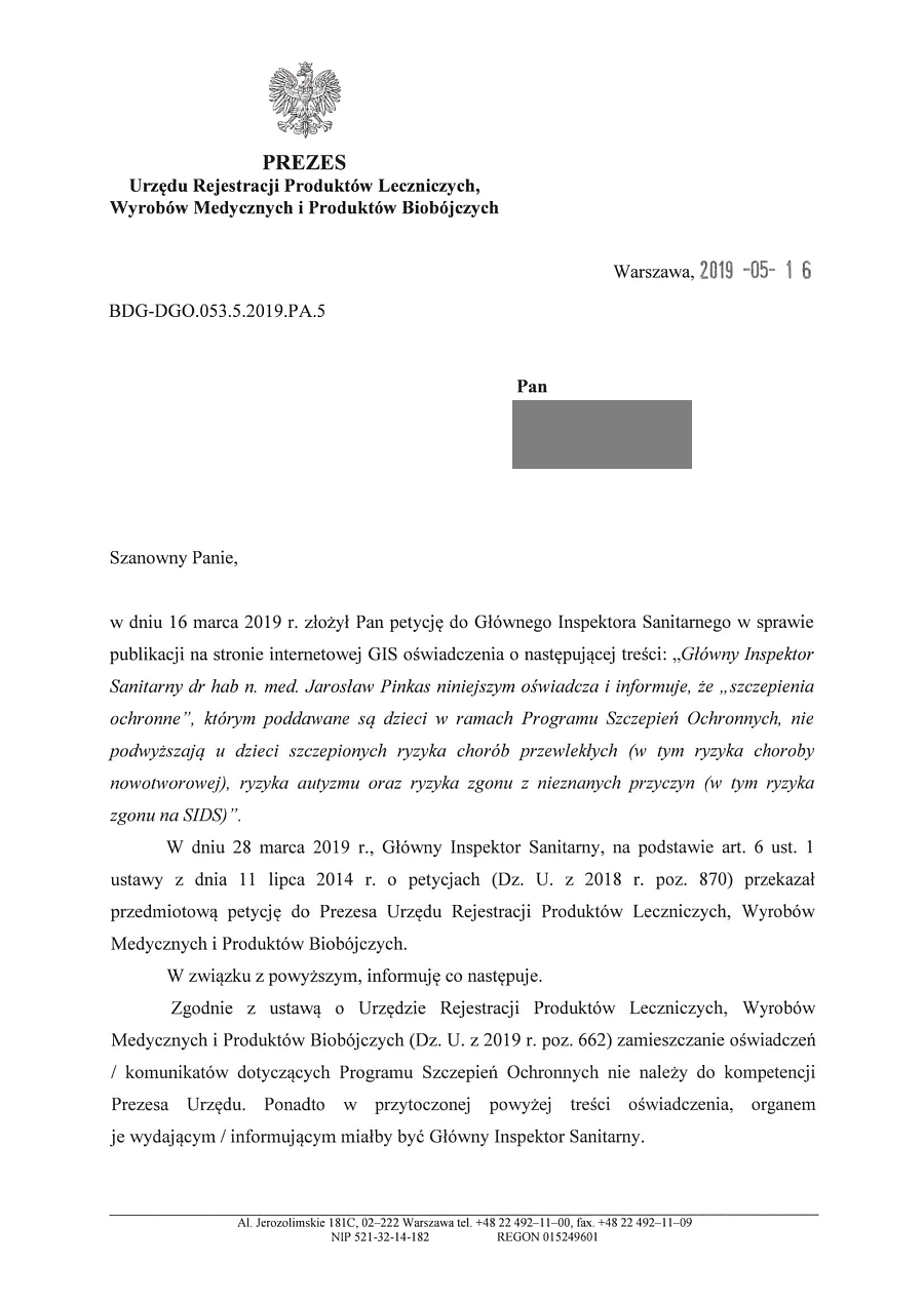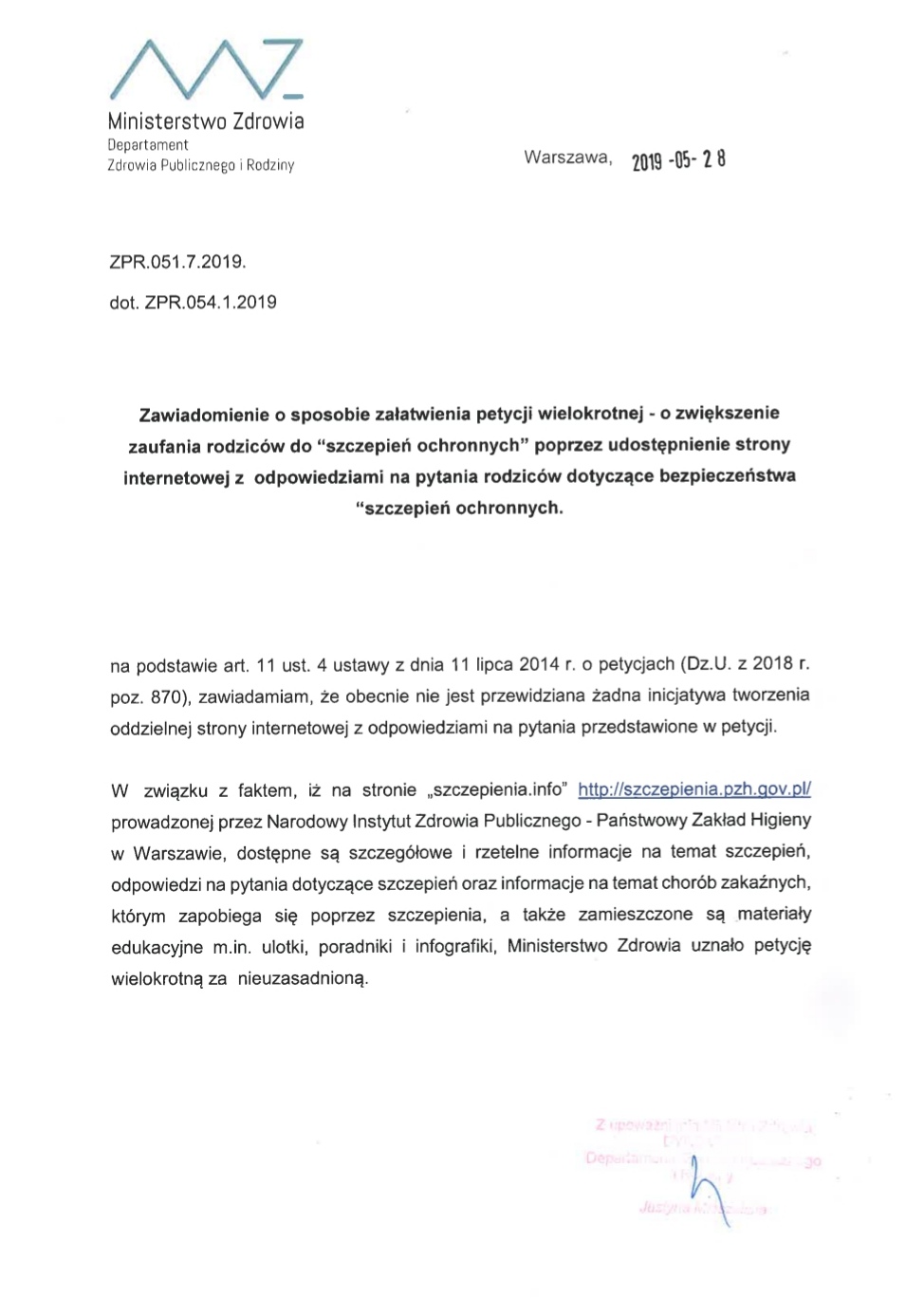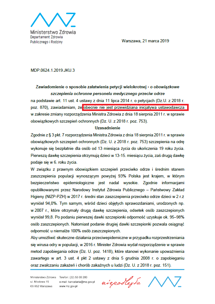W związku z opublikowaniem przez Narodowy Instytut Zdrowia Publicznego – Państwowy Zakład Higieny w dniu 21 lutego 2019 r. petycji wielokrotnej na podstawie art. 63 Konstytucji Rzeczypospolitej Polskiej z dnia 2 kwietnia 1997r., w trybie określonym w Ustawie z dnia 11 lipca 2014r. o petycjach (Dz.U. 2014 poz. 1195) .