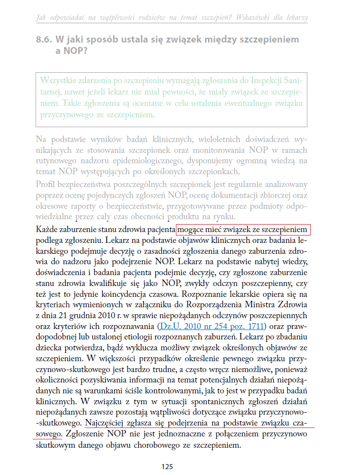 Końcówka strony, z niby niepozorną informacją, że „najczęściej zgłasza się podejrzenia na podstawie związku czasowego” jest perfekcyjnym dopełnieniem manipulacji, której poddawany jest lekarz zapoznający się z treścią poradnika.