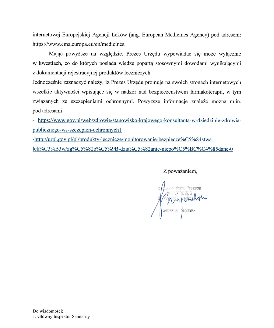 W uzupełnieniu należy wyjaśnić, że sugerowany w petycji związek pomiędzy szczepieniami a podwyższonym ryzykiem wystąpienia SIDS nie ma potwierdzenia w wynikach badań prowadzonych zgodnie z zasadami medycyny opartej na faktach (Evidence Base Medicine). Szczegółowe informacje wyjaśniające brak związku pomiędzy zespołem nagłego zgonu niemowląt (SIDS- sudden infant death syndrome) oraz szczepieniami dostępne są na stronie NIZP-PZH pod adresem: