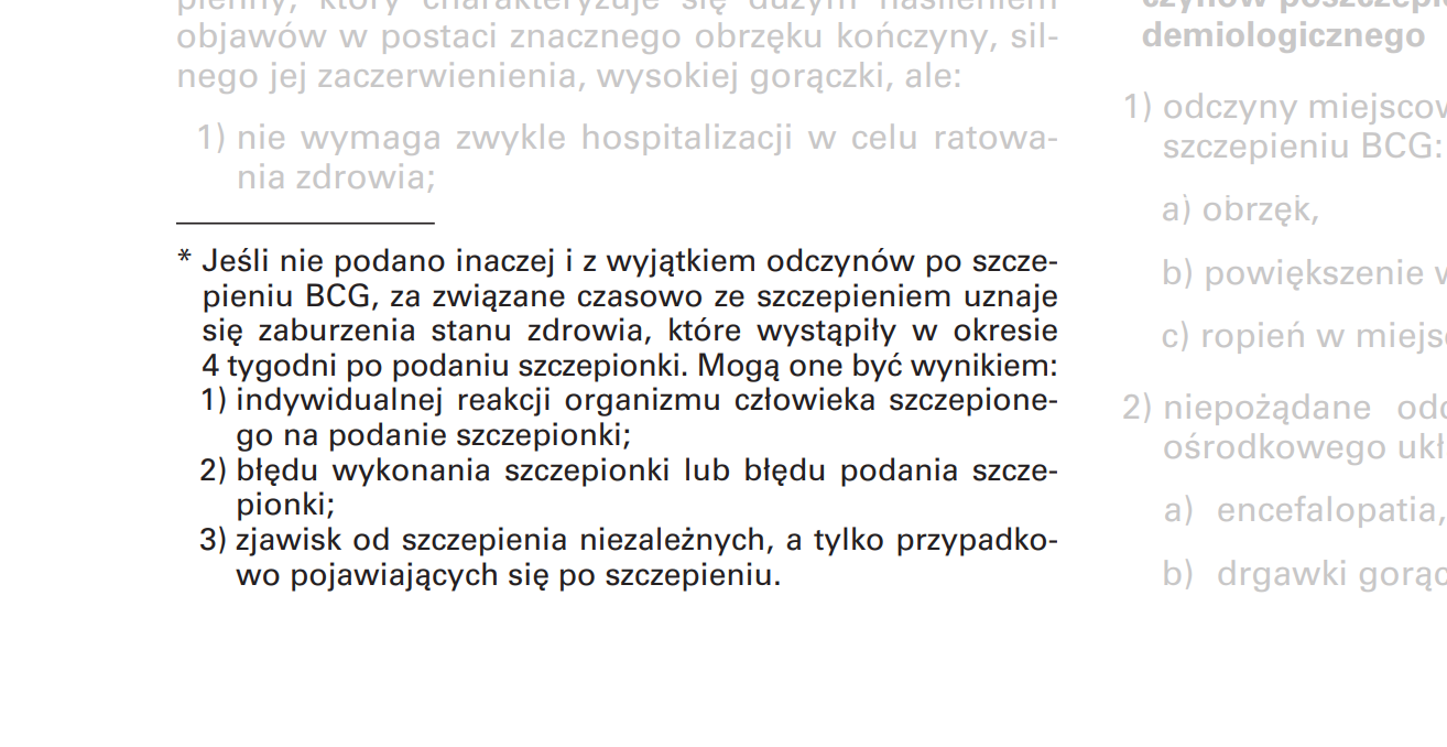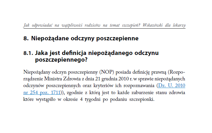 1/ Autorzy przewodnika “Jak odpowiadać na wątpliwości rodziców na temat szczepień” powołują się na definicje prawną niepożądanego odczynu poszczepiennego (NOP) wskazaną w Rozporządzeniu Ministra Zdrowia z dnia 21 grudnia 2010 r. w sprawie niepożądanych odczynów poszczepiennych oraz kryteriów ich rozpoznawania (Dz. U. 2010 nr 254 poz. 1711), zgodnie z którą jest to każde zaburzenie stanu zdrowia związane ze szczepieniem, które wystąpiło w okresie 4 tygodni po podaniu szczepionki. “.