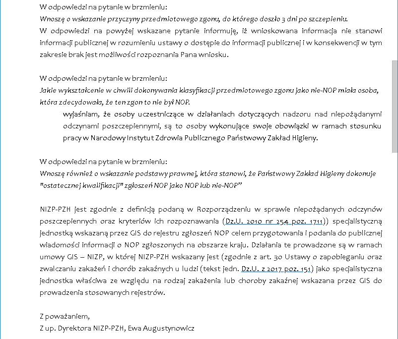 Wnoszę również o wskazanie, na jakiej podstawie prawnej i według jakich kryteriów PZH uznaje, że zgon czasowo zbieżny ze szczepieniem nie jest niepożądanym odczynem poszczepiennym, jak miało to miejsce na przykład w przypadku czterech zgonów zgłoszonych jako NOP przez lekarzy w roku 2014, które PZH w raporcie o szczepieniach ochronnych za rok 2014 zakwalifikował nie jako NOP a jako „inne zgłoszenia”. Wnoszę również o wskazanie, w jaki sposób dziecko musiałoby umrzeć kilka dni po szczepieniu, aby PZH uznał, że ten zgon to NOP.