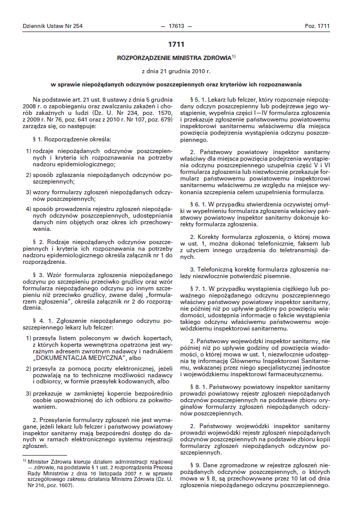 3/ Zgłoszenie niepożądanego odczynu poszczepiennego dokonuje lekarz lub felczer stosując rodzaje i kryteria rozpoznawania niepożądanego odczynu poszczepiennego na potrzeby nadzoru epidemiologicznego wymienione w załączniku 1 do Rozporządzenia Ministra Zdrowia z dnia 21 grudnia 2010 r. w sprawie niepożądanych odczynów poszczepiennych oraz kryteriów ich rozpoznawania (Dz. U. 2010 nr 254 poz. 1711).