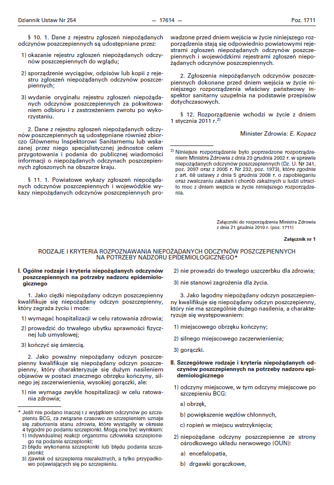 Rozporządzenie Ministra Zdrowia z dnia 21 grudnia 2010 r. w sprawie niepożądanych odczynów poszczepiennych oraz kryteriów ich rozpoznawania (Dz. U. 2010 nr 254 poz. 1711) jest aktem wykonawczym Ustawy z dnia 5 grudnia 2008 roku o zapobieganiu oraz zwalczaniu zakażeń i chorób zakaźnych u ludzi, gdzie w artykule 16 podano definicję NOP w brzmieniu: objaw pozostający w związku czasowym z wykonywanym szczepieniem. W ww Rozporządzeniu podano wyjaśnienie jak należy interpretować zapis ustawy. Wskazano, że NOP na potrzeby nadzoru epidemiologicznego jako związany czasowo ze szczepieniem definiowany jest jako zaburzenia stanu zdrowia, które wystąpiły w okresie 4 tygodni po podaniu szczepionki (jeżeli nie podano inaczej i z wyjątkiem odczynów) po szczepieniu BCG. Dodatkowo uszczegółowiona definicja NOP wskazana w ww Rozporządzeniu podaje, że NOP mogą być wynikiem: