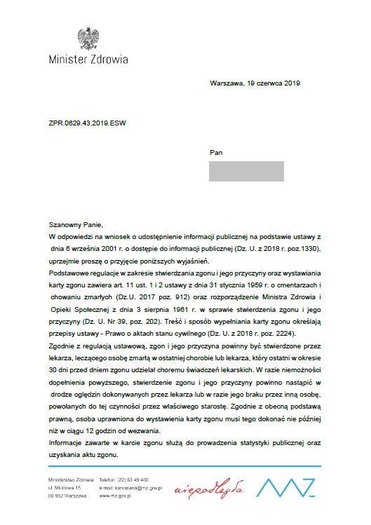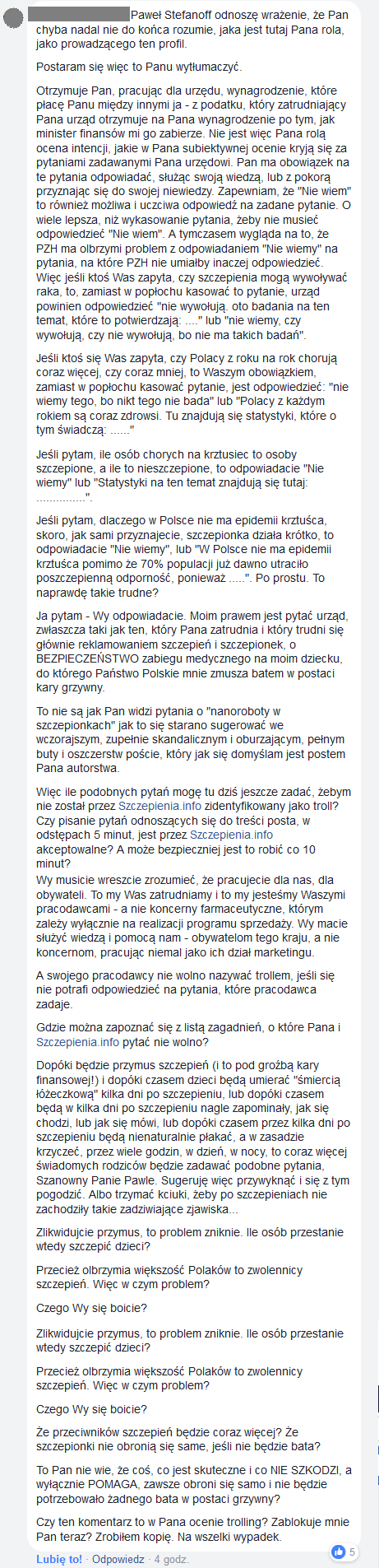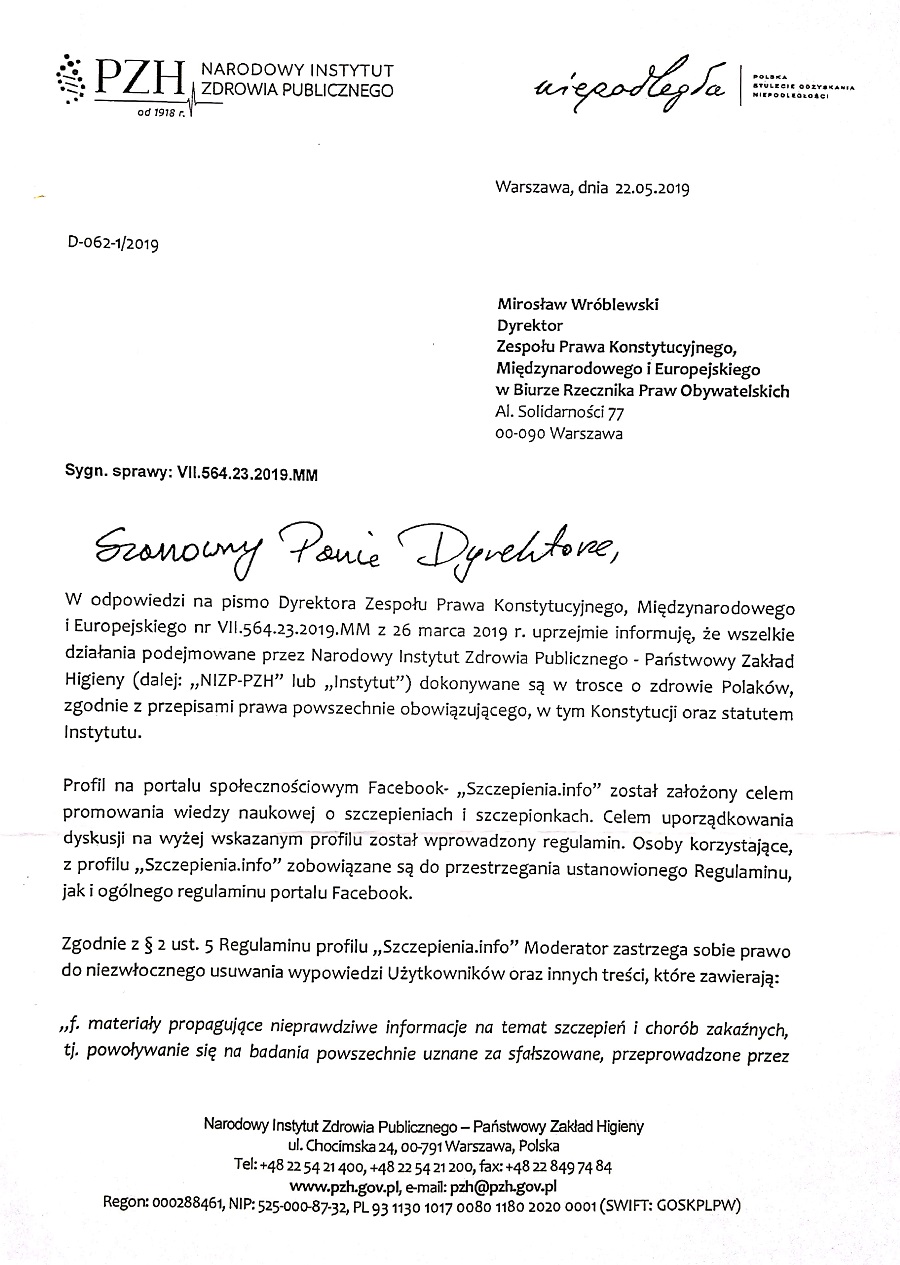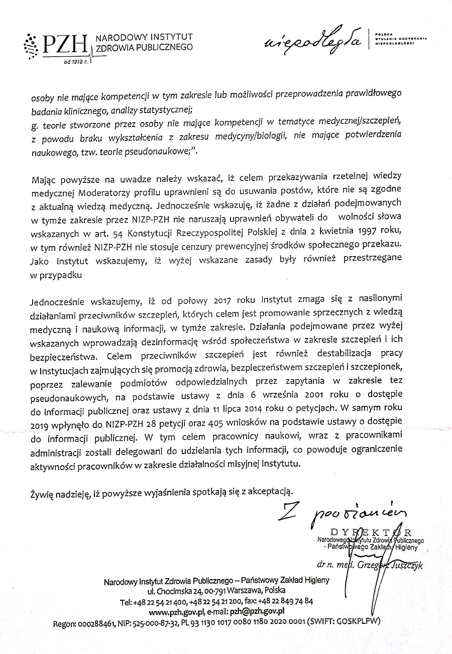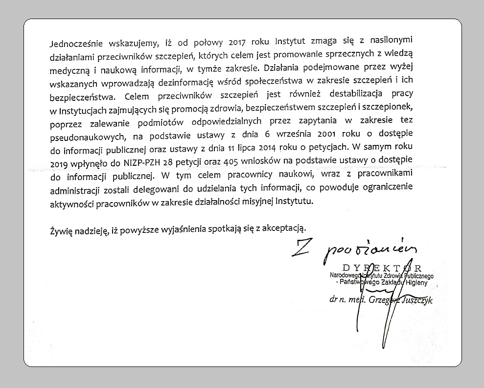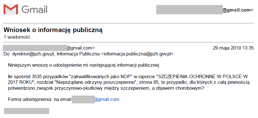 Otrzymana przeze mnie wiadomość nie zawiera więc wnioskowanej przeze mnie informacji publicznej, czyli liczby przypadków „zakwalifikowanych jako NOP” w raporcie „SZCZEPIENIA OCHRONNE W POLSCE W 2017 ROKU”, rozdział „Niepożądane odczyny poszczepienne”, strona 85, dla których z całą pewnością potwierdzono związek przyczynowo-skutkowy między szczepieniem, a objawem chorobowym. Urząd z niezrozumiałych dla mnie przyczyn udostępnił mi informacje, o które nie wnioskowałem, informując mnie, zgodnie z jakimi aktami prawnymi prowadzony jest nadzór nad niepożądanymi odczynami poszczepiennymi oraz jakiej definicji NOP odpowiadają “całościowo” informacje na temat NOP, podczas gdy w przedmiotowym wniosku wnosiłem o zupełnie inną informację, czyli o liczbę niepożądanych odczynów poszczepiennych spełniających kryterium potwierdzenia związku przyczynowo-skutkowego między szczepieniem a wystąpieniem NOP.