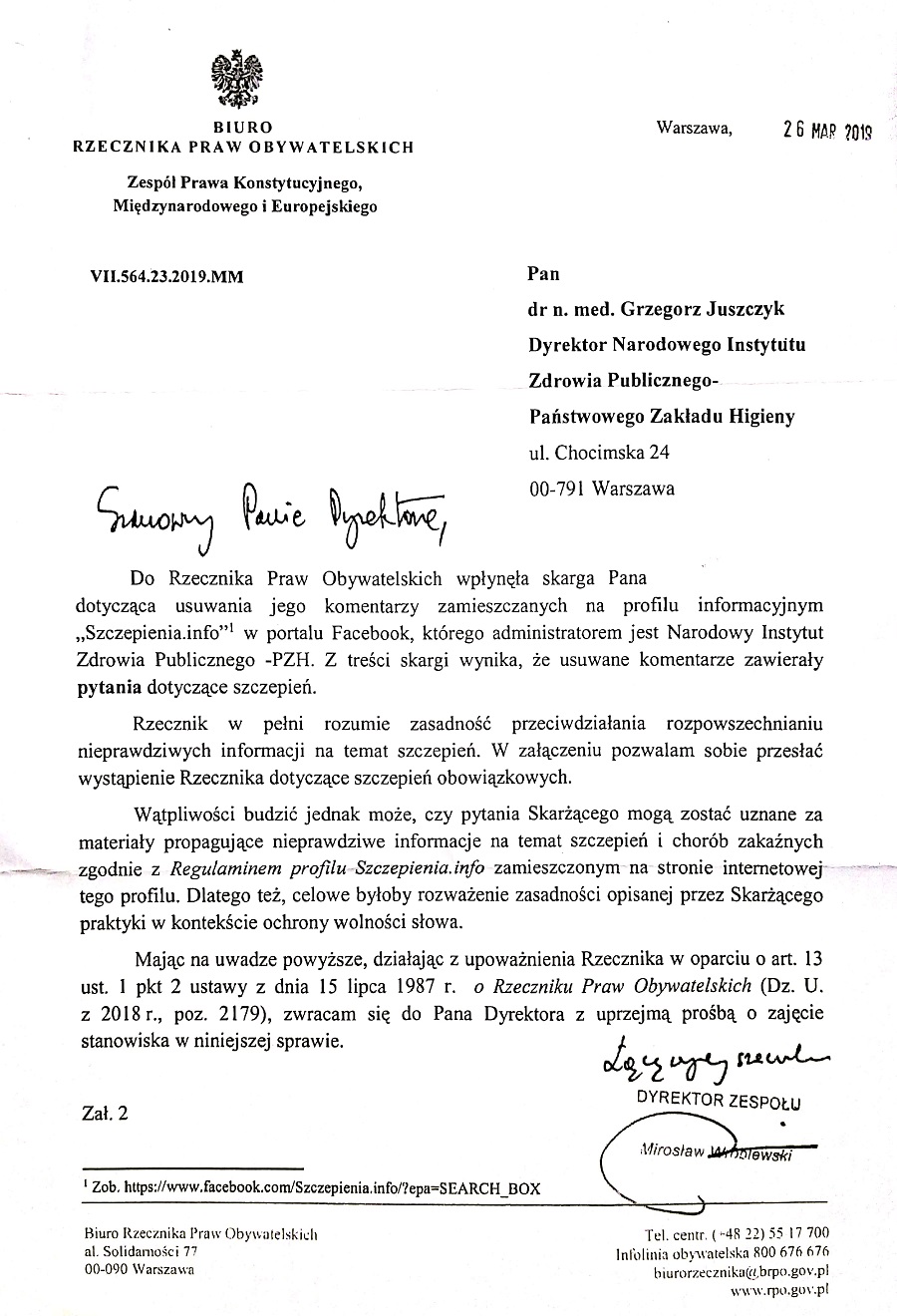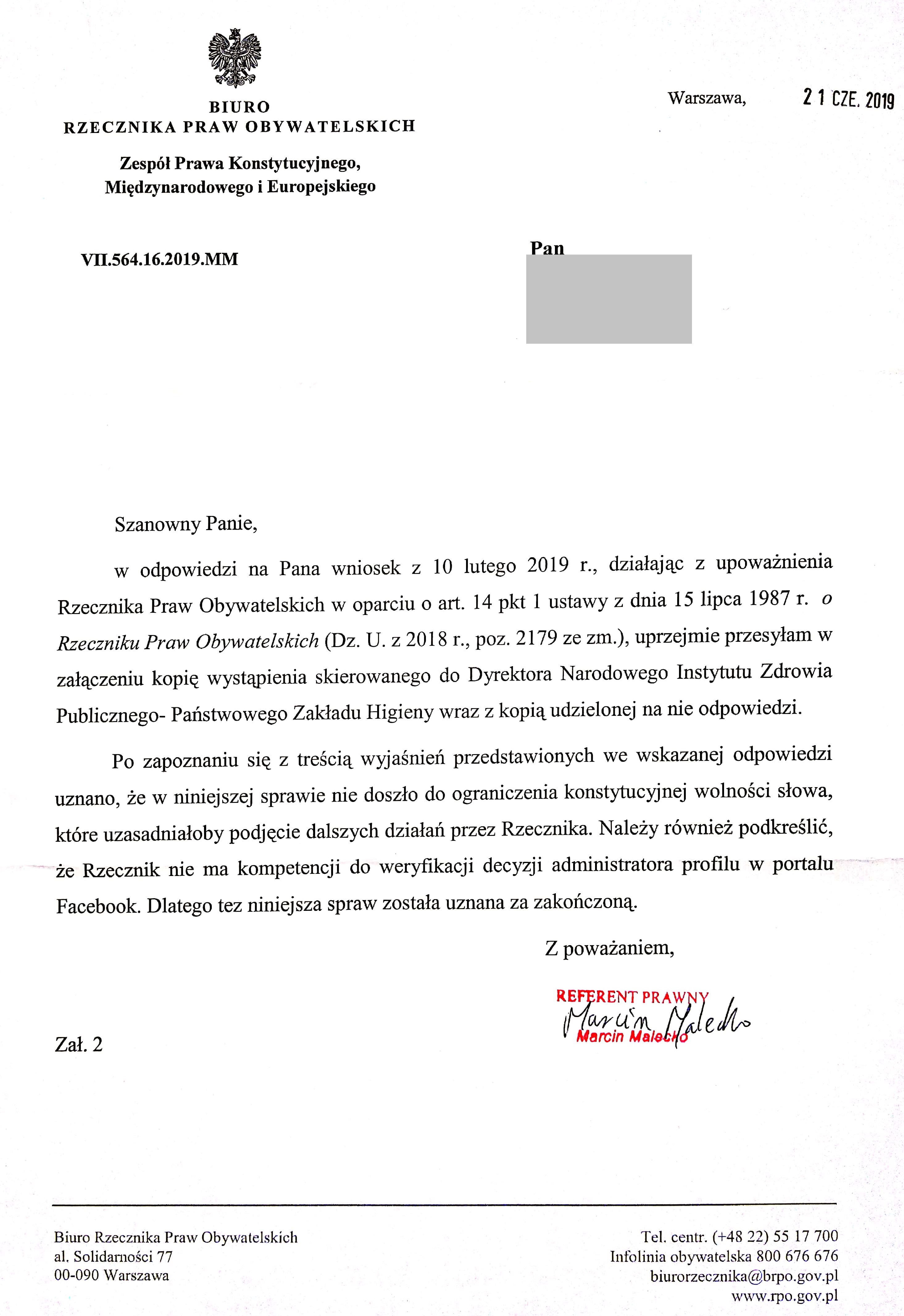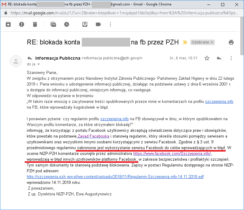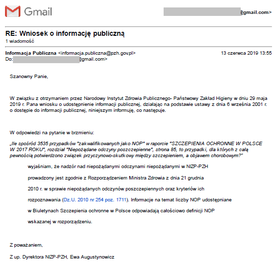W dniu 13 czerwca 2019 NIZP-PZH przesłał mi wiadomość email o następującej treści: