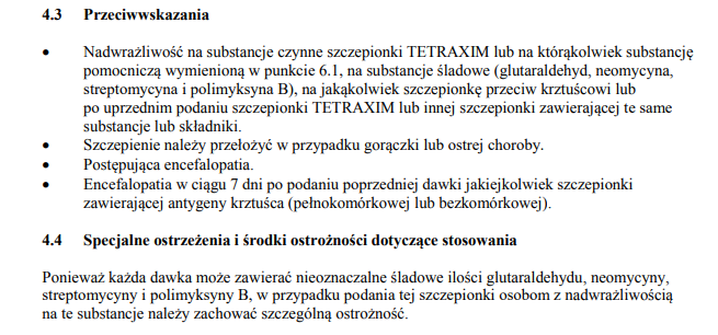 A: Przeciwwskazaniem jest „Nadwrażliwość na substancje czynne szczepionki TETRAXIM lub naktórąkolwiek substancję pomocniczą wymienioną w punkcie 6.1, na substancje śladowe (glutaraldehyd, neomycyna, streptomycyna i polimyksyna B), na jakąkolwiek szczepionkę przeciw krztuścowi lub po uprzednim podaniu szczepionki TETRAXIM lub innej szczepionki zawierającej te same substancje lub składniki.