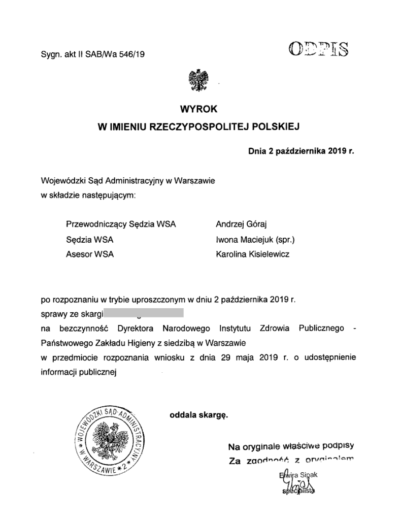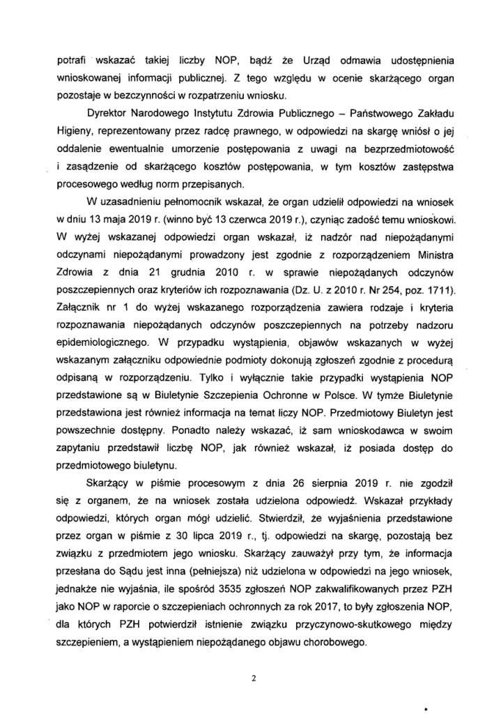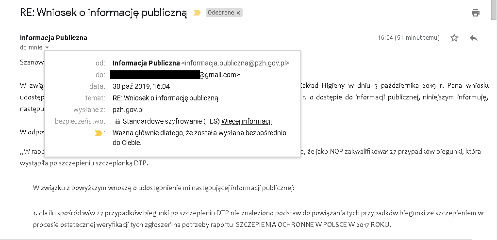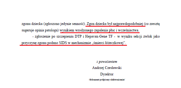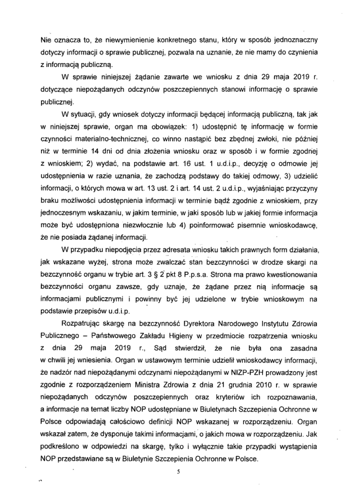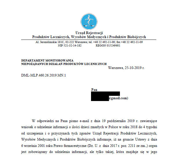 „Jednocześnie informuję, że informacji publicznej nie stanowią teoretyczne rozważania nad kalendarzem szczepień ze wskazaniem na dane, które będą świadczyły o tym, że dzieci szczepione według tego kalendarza szczepień są zdrowsze od dzieci nieszczepionych.”