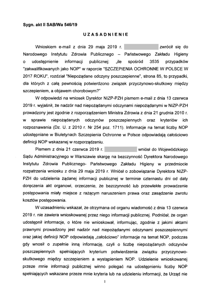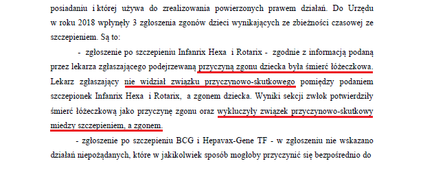 „Ze względu na fakt, iż poziom zaszczepienia populacji objętej realizacją obowiązku (dzieci od 0 do 19 r.ż) na poszczególne choroby zakaźne jest w naszym kraju wysoki i przekracza poziom 93% uniemożliwia przeprowadzenie analizy, o której mowa we wniosku.”