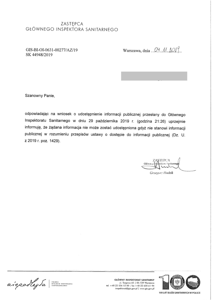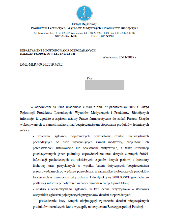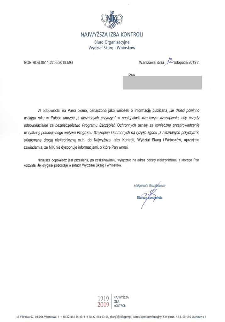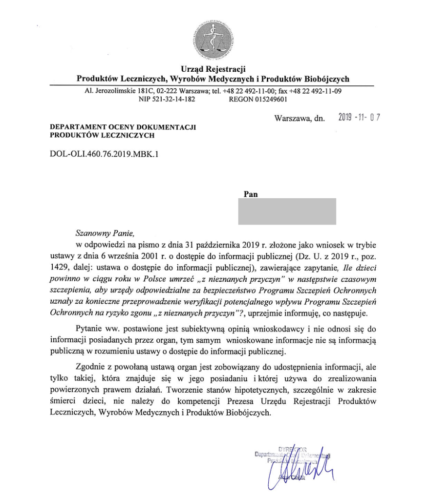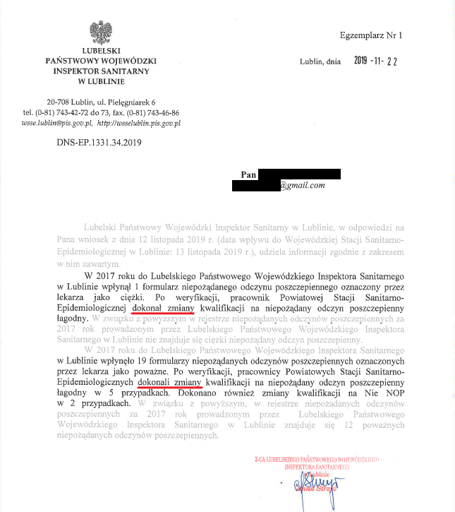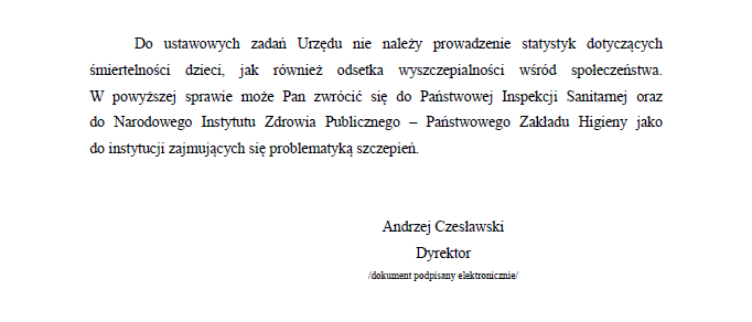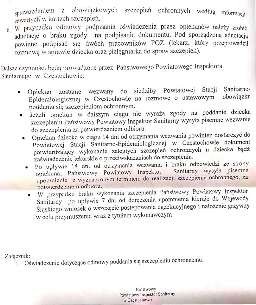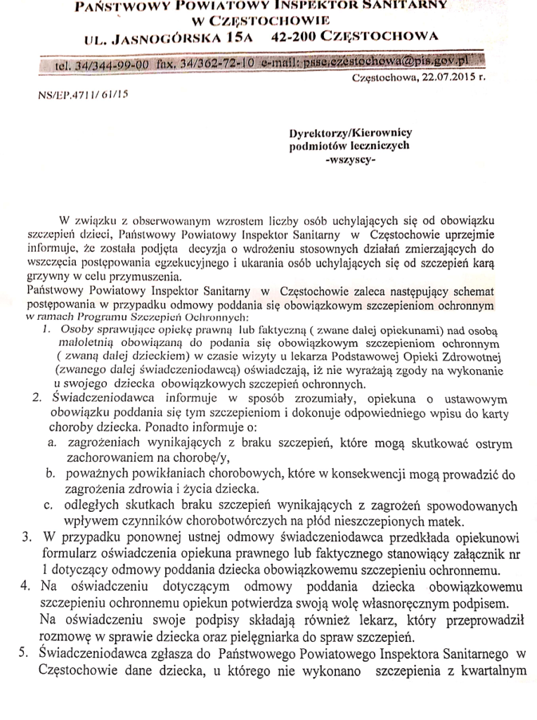 W razie gdyby Przychodnia ….. pomimo faktu niedopełnienia przez lekarza obowiązków wynikających z art. 17 w/w Ustawy o zapobieganiu oraz zwalczaniu zakażeń i chorób zakaźnych u ludzi niezgodnie ze stanem faktycznym przekazała do Państwowej Inspekcji Sanitarnej niezgodną z prawdą informację, jakobyśmy rzekomo „uchylali się” od poddania naszego dziecka szczepieniom ochronnym informujemy, że będziemy zmuszeni wówczas podjąć wobec osób odpowiedzialnych za tego typu oczywiste poświadczenie nieprawdy przewidziane prawem kroki celem ochrony naszych dóbr osobistych.