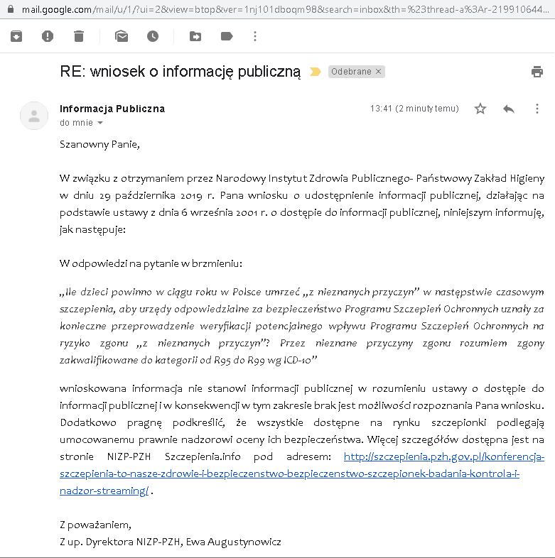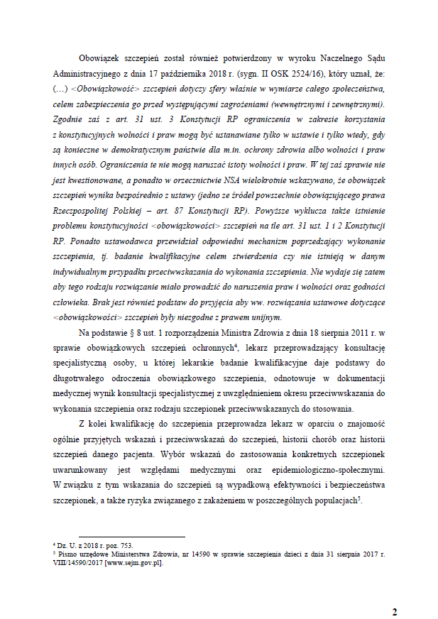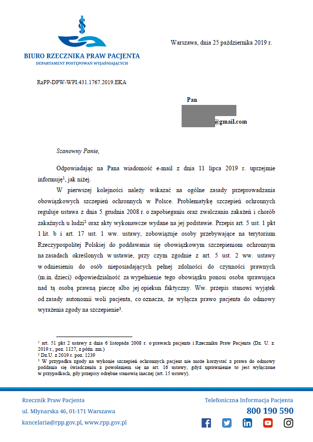 Pielęgniarka na zakończenie wręczyła rodzicom wydruk dokumentu, który nie był żadną odpowiedzią radcy prawnego, bo była to po prostu dostępna publicznie opinia prawna kilku prawników wydrukowana z tej strony internetowej: https://www.ispoz.pl/wp-content/uploads/2019/10/wersja2Pytania-STOPNOP-szczepienia-obowi%C4%85zkowe.pdf