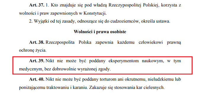„Nikt nie może być poddany eksperymentom naukowym, w tym medycznym, bez dobrowolnie wyrażonej zgody.”