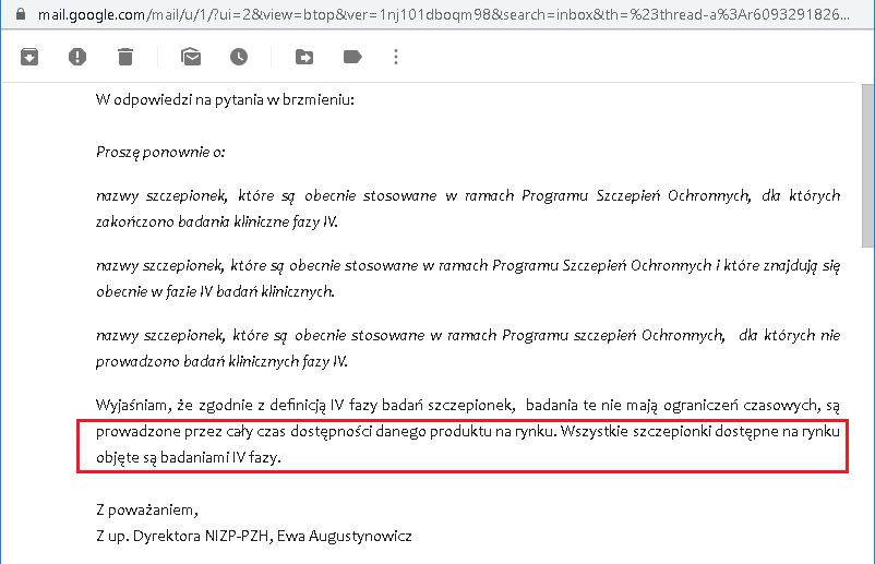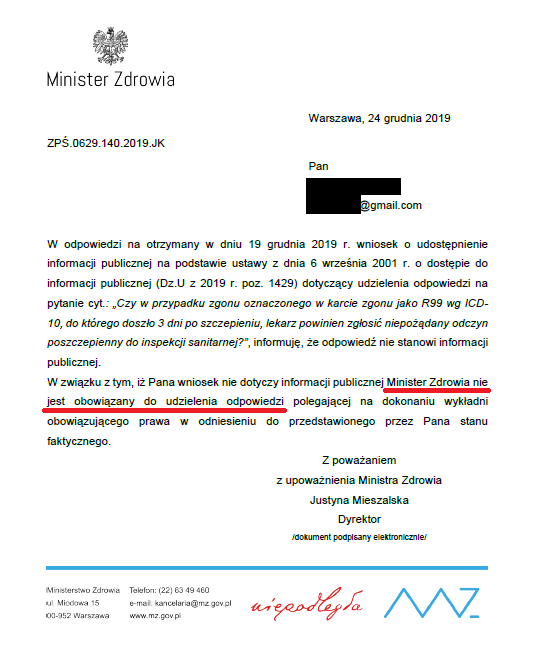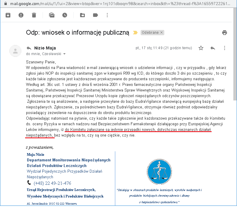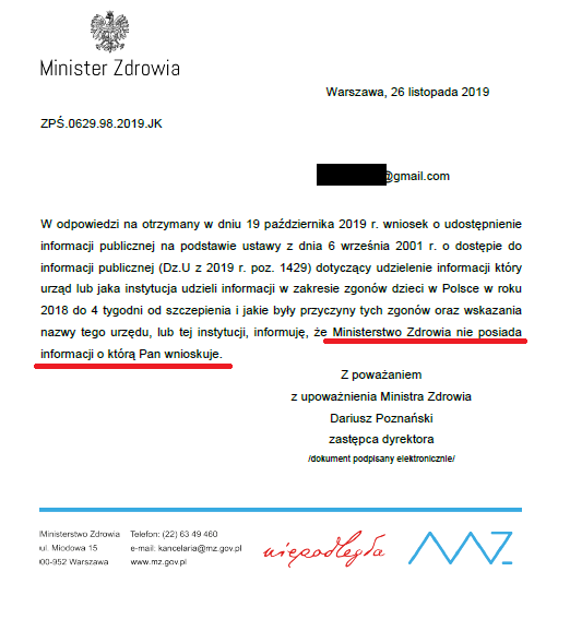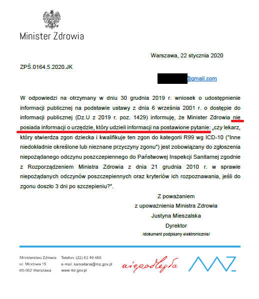 Nie sposób się nawet dowiedzieć (od Ministra Zdrowia lub Głównego Inspektora Sanitarnego), czy lekarz powinien zgłosić ciężki NOP (niepożądany odczyn poszczepienny) zakończony zgonem, gdy dziecko umrze “z nieznanych przyczyn” 3 dni po szczepieniu.