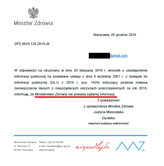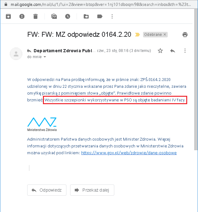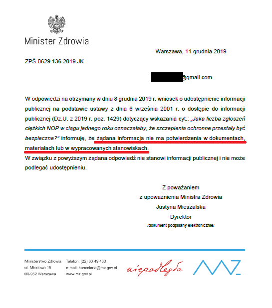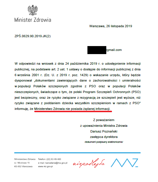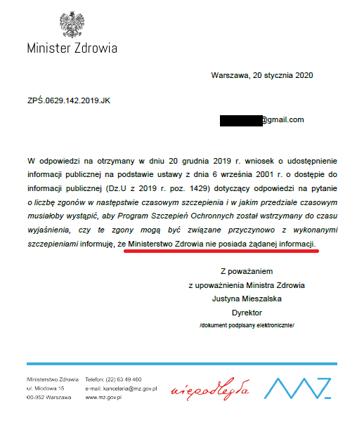 Jak w tej sytuacji mam ufać – jako rodzic – w wiarygodność i rzetelność polskiego systemu “monitorowania bezpieczeństwa szczepień”, skoro twórca tego systemu, czyli Minister Zdrowia, nie wie, czy lekarz powinien zgłosić NOP, jeśli dziecko nagle umrze 3 dni po szczepieniu, a przyczyny zgonu będą nieznane? Skąd lekarze mają wiedzieć, czy w takim przypadku powinni zgłosić NOP, skoro sam Minister Zdrowia tego nie wie?