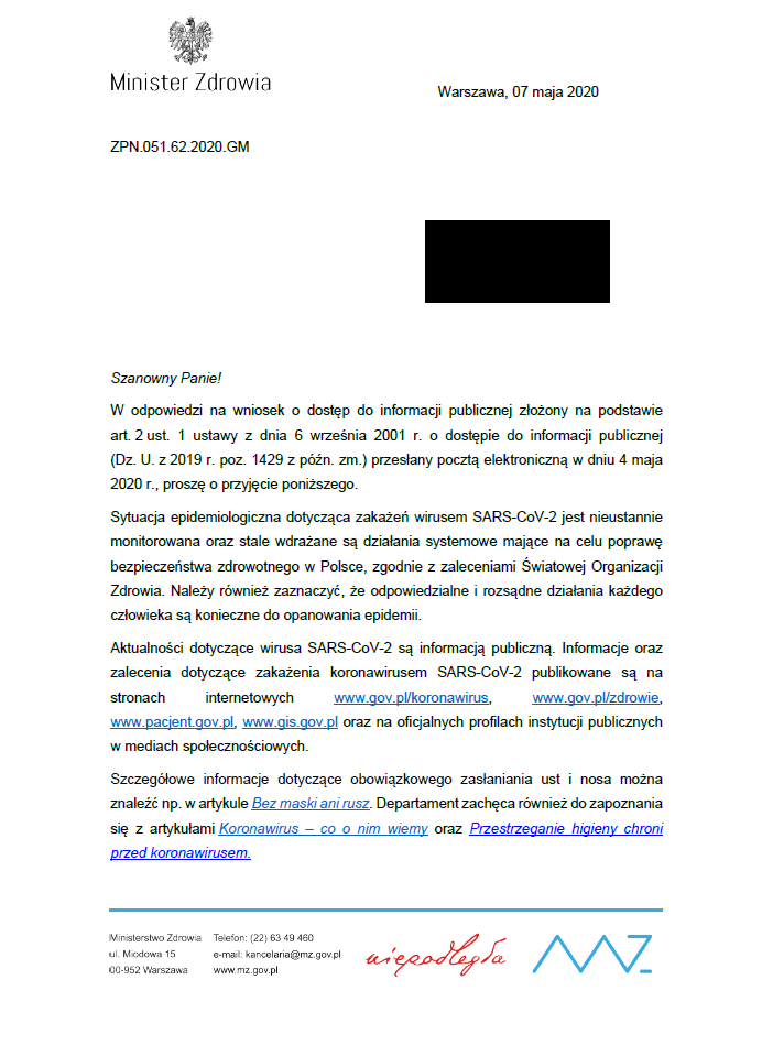 Nadmieniam, że informacja, jaki odsetek osób po kontakcie z wirusem SARS-CoV-2 stanowią osoby, u których potwierdzono zachorowanie na COVID-19, pozwoliłaby ocenić rzeczywistą skalę zagrożenia ze strony tego wirusa, albowiem informacja o śmiertelności w stosunku jedynie do potwierdzonych przypadków zachorowań jest bezwartościowa dopóki nie wiadomo, w jakim stopniu wirus rozprzestrzenił się w populacji.