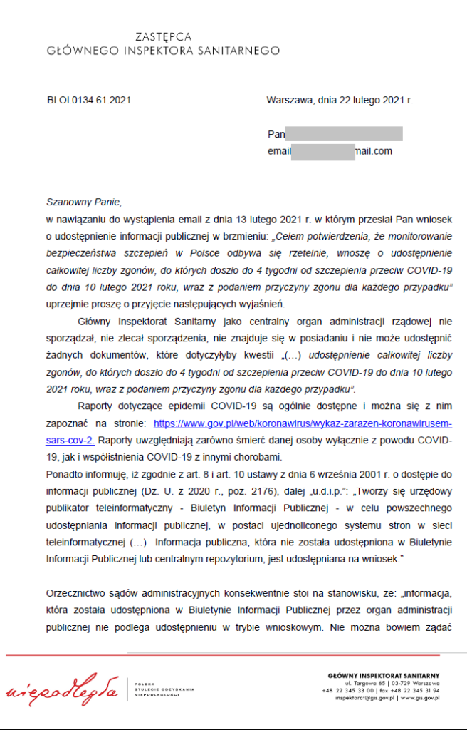 W odpowiedzi na powyższą odpowiedź napisałem do Ministerstwa Zdrowia tak: