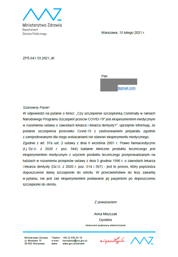Jak więc widać, Ministerstwo Zdrowia nie potrafi zaprzeczyć twierdzeniu, że monitorowane szczepienia przeciw COVID-19 są eksperymentem medycznym – badawczym.