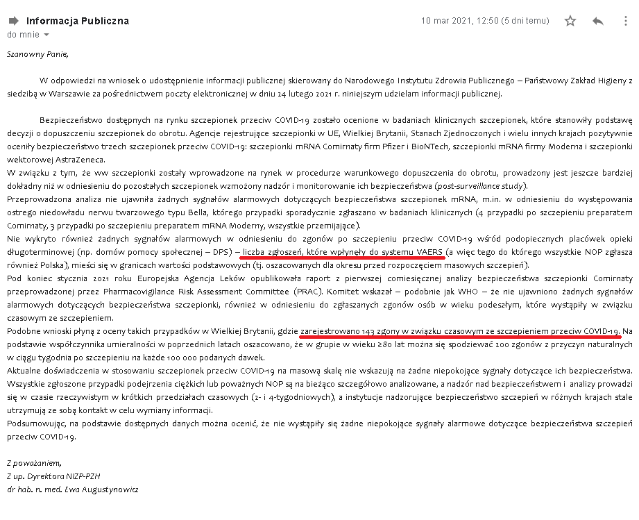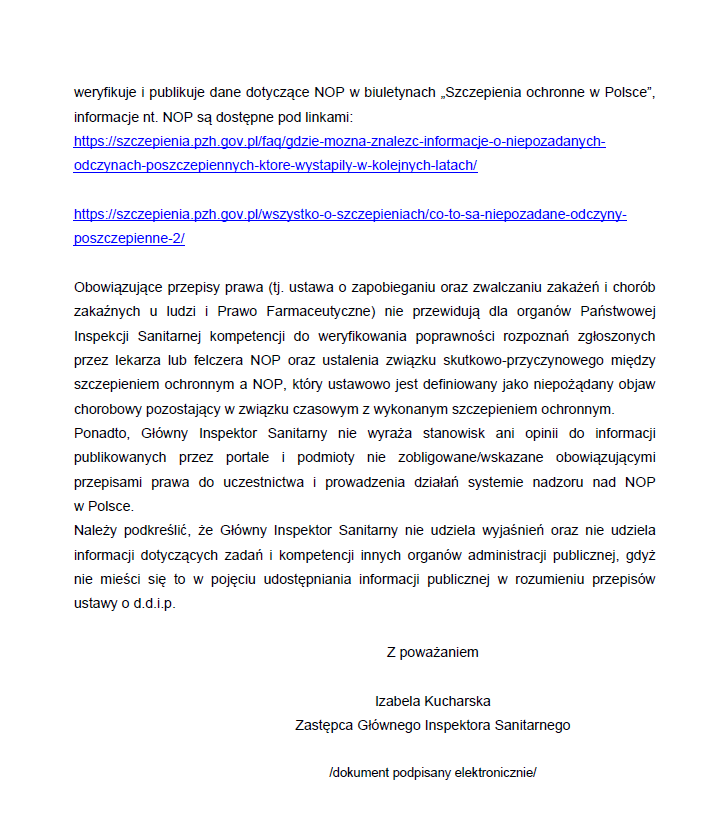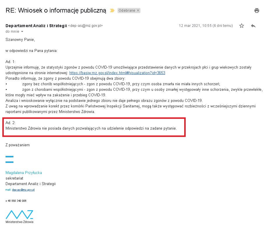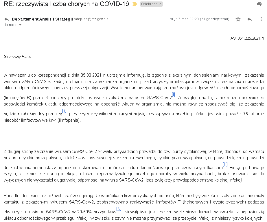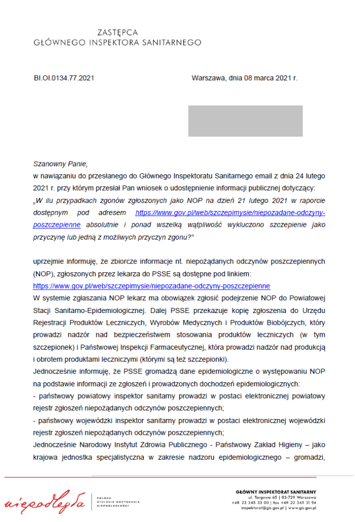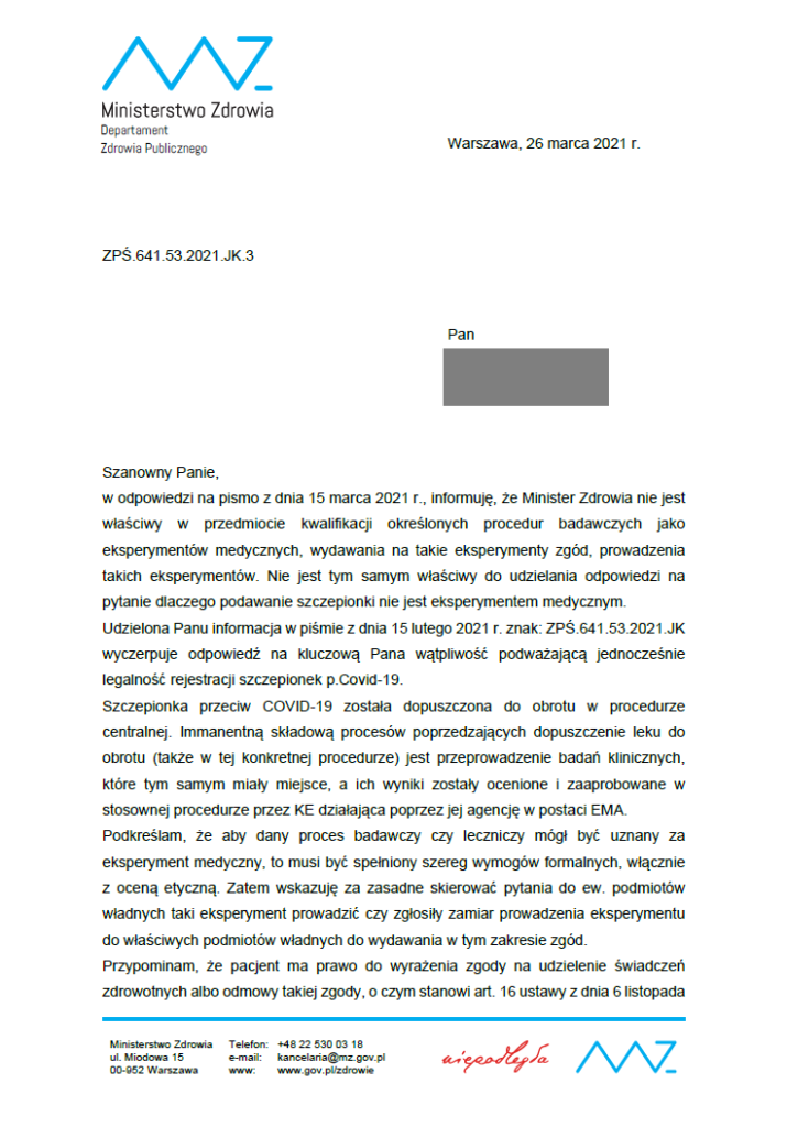 Czyli ostatecznie Ministerstwo Zdrowia przyznaje, że nie potrafi uzasadnić tezy „szczepienie przeciw COVID-19 nie jest eksperymentem medycznym”, którą postawiło w pierwszej wersji odpowiedzi.