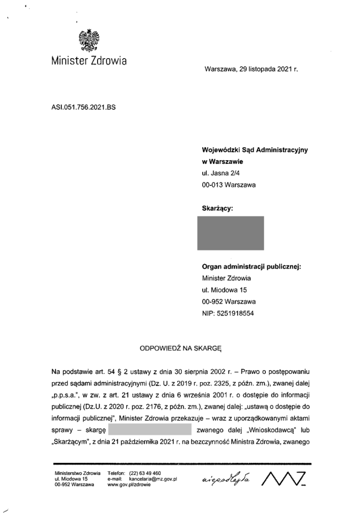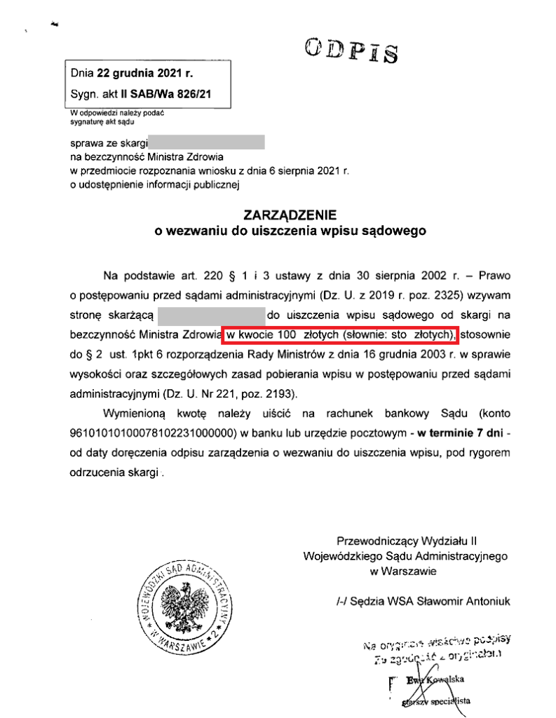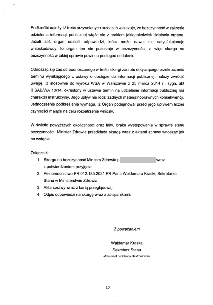 Oto w całości pismo z odmową udostępnienia informacji. Oczywiście będzie odwołanie, a potem skarga do WSA i już nie na bezczynność, tylko na odmowę udostępnienia informacji. I tu już na pewno nie będzie wątpliwości, czy wpłacać do sądu 100 zł wpisu za rozpatrzenie skargi:
