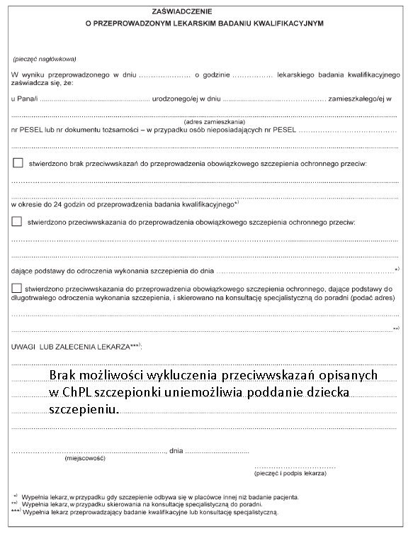 [W zasadzie w tym momencie należało Panią doktor poprosić, aby w takim razie napisała w uwagach w zaświadczeniu o przeprowadzeniu lekarskiego badania kwalifikacyjnego to, co przed chwilą powiedziała, że nie można wykluczyć nadwrażliwości, czyli że wykluczenie przeciwwskazań jest niewykonalne i na tym ta wizyta kwalifikacyjna powinna się zakończyć]