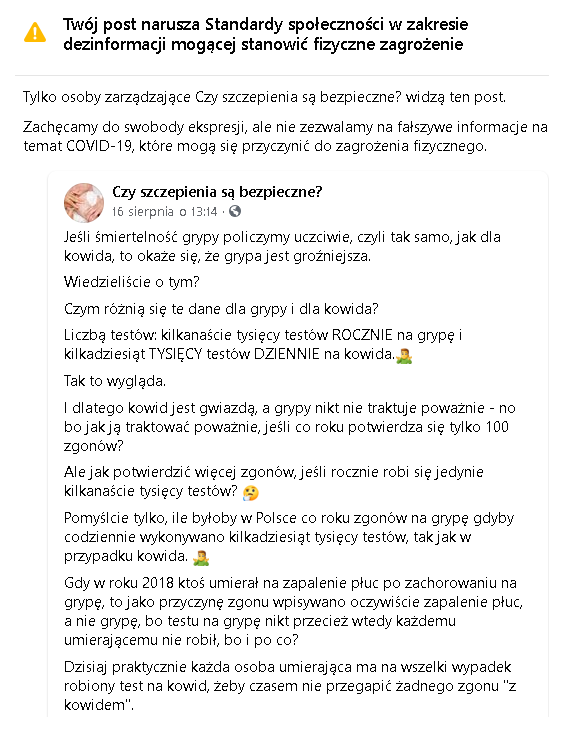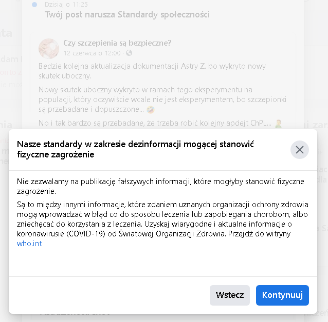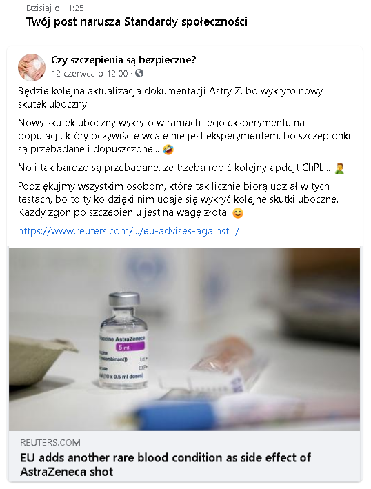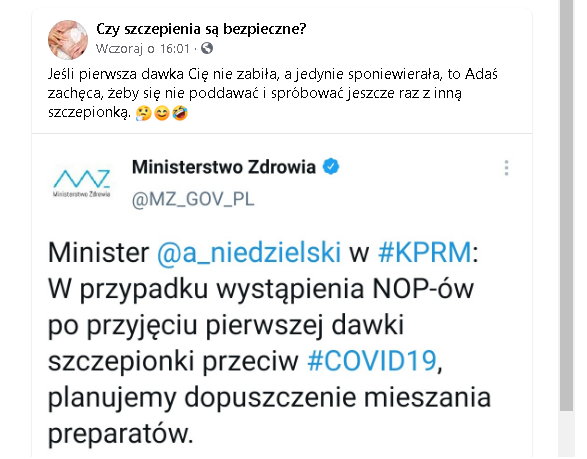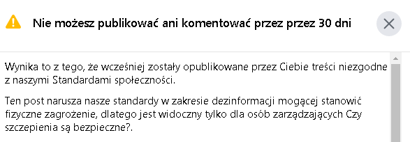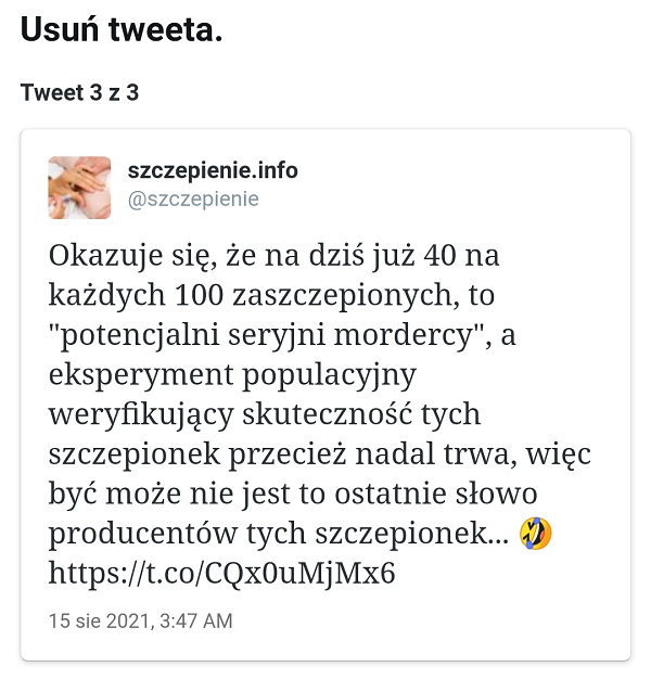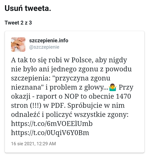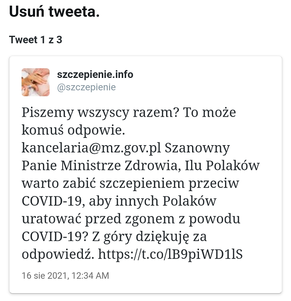 Czyli nie wolno pytać Ministra Zdrowia, ile ludzi może umrzeć w wyniku szczepienia, aby nadal opłacało się szczepić ratując innych ludzi przed kowidem. Prawdopodobnie gdyby napisać, że w wyniku szczepienia można umrzeć, to Twitter też by uznał, że tak nie wolno, bo nie wolno o tym informować, gdyż ludzie nie powinni wiedzieć o tym, że szczepiąc się zawsze w jakimś stopniu ryzykują swój własny zgon w wyniku szczepienia.