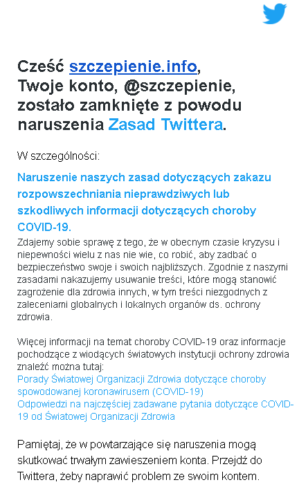 Twitter zablokował konto @szczepienie.info szantażując, że odblokuje je dopiero wtedy, gdy 3 twitty z „nieprawdziwymi lub szkodliwymi informacjami” zostaną usunięte.