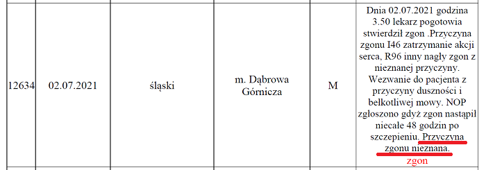 Do tego twitta był dołączony fragment oficjalnego raportu o NOP, który jest przecież dowodem na to, że w przypadku zgonu, który może być zgonem w wyniku szczepienia, uznaje się, że przyczyna zgonu jest nieznana i statystyki zgonów „po szczepieniu” nadal są czyste.