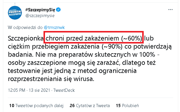 Ten twitt był jedynie cytatem twitta profilu @SzczepimySię, w którym sam rząd przyznaje, że szczepienie chroni przed kowidem tylko w 60%, czyli 40 na 100 zaszczepionych może się zarazić, a więc również zarażać innych, więc osoba zaszczepiona jako „potencjalny morderca” może też kogoś zabić zarażając go kowidem: