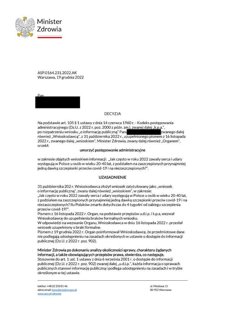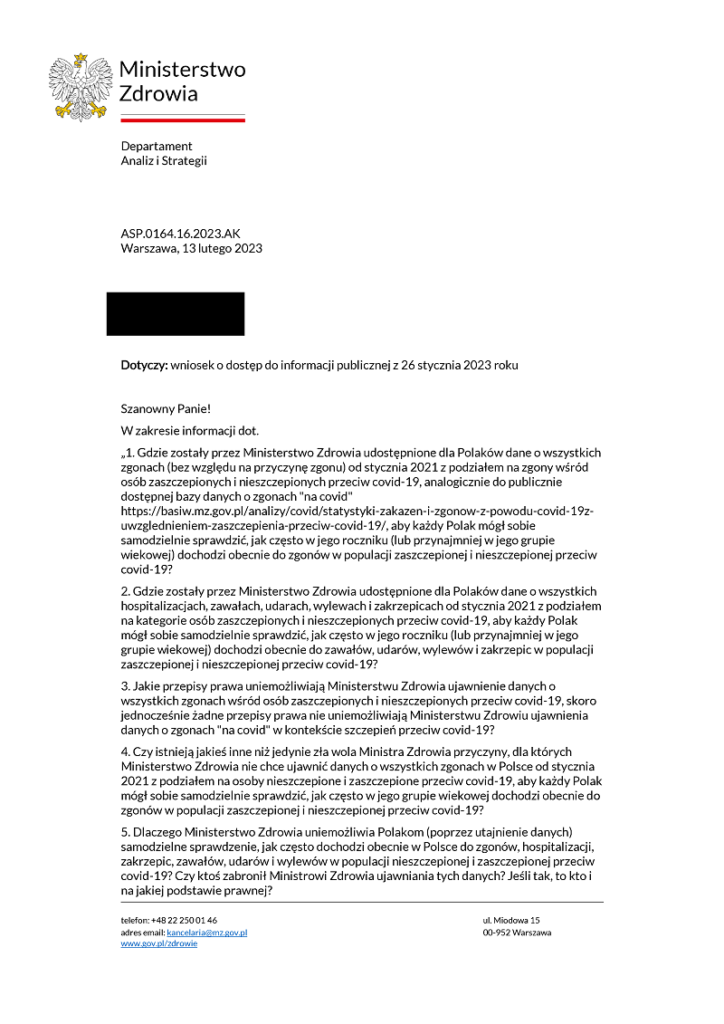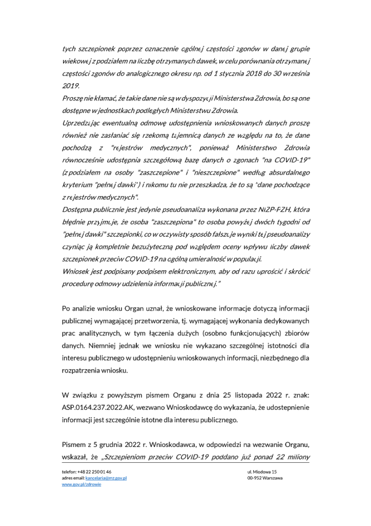 Gdy już więc Ministerstwo Zdrowia wytworzy taką bazę danych na potrzeby mojego wniosku (skoro do tej pory jeszcze tego nie zrobiło), to wtedy już nawet samo Ministerstwo Zdrowia będzie mogło ujawnić tę bazę i udostępnić ją publicznie, tak jak udostępniło bazę danych o wszystkich zgonach „na Covid-19” z podziałem na osoby „zaszczepione” i „nieszczepione”.