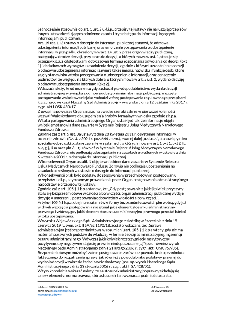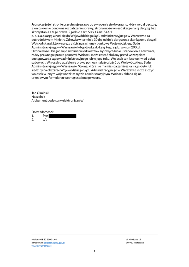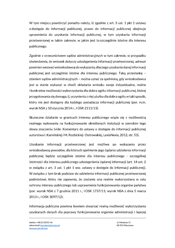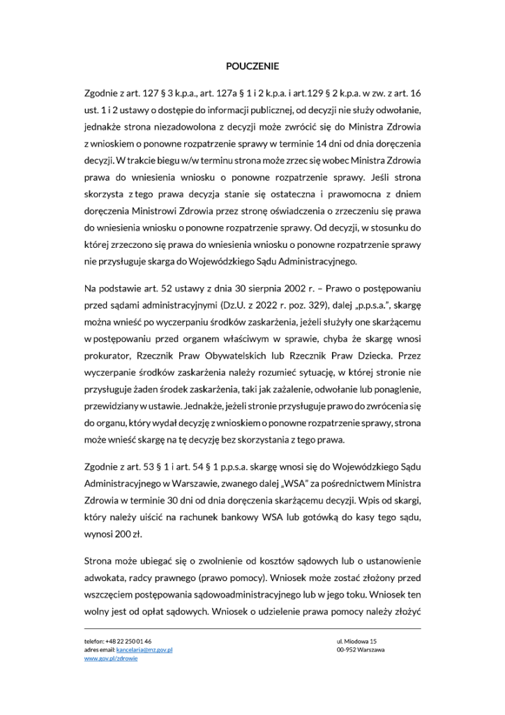 W trybie art. 3 § 2 pkt 1 w zw. z art. 50 § 1 Prawa o postępowaniu przed sądami administracyjnymi (dalej jako: PPSA) we własnym imieniu zaskarżam decyzję Ministra Zdrowia z dnia 04-01-2023 (sygnatura pisma ASP.0164.237.2022) o odmowie udostępnienia informacji ze względu na uznanie, iż przedmiotem złożonego wniosku była informacja przetworzona, a organ stwierdził, że nie została spełniona przesłanka szczególnej istotności dla interesu publicznego.