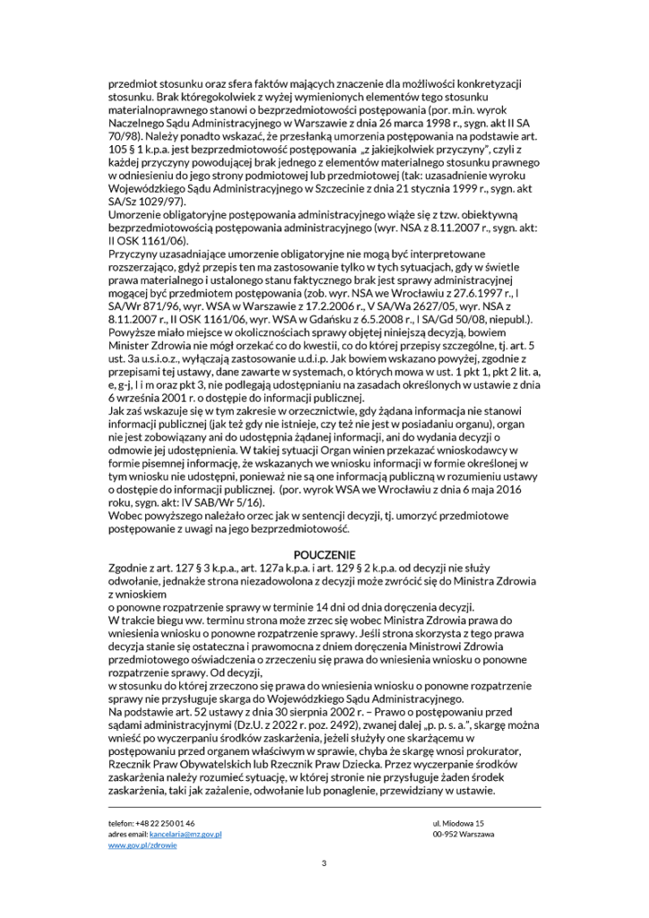na decyzję Ministra Zdrowia (dalej: Organ) z dnia 04-01-2023 sygn. ASP.0164.237.2022 o odmowie udostępnienia informacji publicznej.