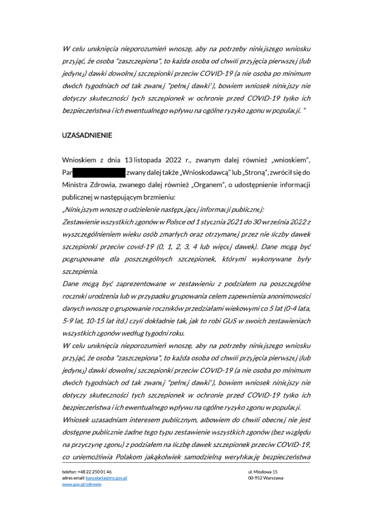 Z drugiej strony – jeśli z danych, o które wnioskuję, wynika, że ogólne ryzyko zgonu w populacji zaszczepionej nie jest wyższe, niż ogólne ryzyko zgonu w TAKIEJ SAMEJ populacji nieszczepionej (lub może nawet jest wręcz niższe!), to ujawnienie takich danych jest również szczególnie istotne dla interesu publicznego, ponieważ mogłoby to wielu nieprzekonanych dotychczas Polaków zachęcić do szczepienia o tak zbawiennym wpływie na ogólne ryzyko zgonu. Dalsze ukrywanie tych danych przez Ministerstwo Zdrowia będzie generować coraz więcej wątpliwości dotyczących bezpieczeństwa szczepionek przeciw COVID-19, ponieważ jeśli te dane są ukrywane, to pewnie wyłania się z nich niekorzystny obraz bezpieczeństwa szczepionek przeciw COVID-19 i dlatego tych danych nie wolno ujawnić – taki może być sposób myślenia wielu Polaków, zniechęcający ich do szczepienia – być może zupełnie niepotrzebnie, ale to będzie można ocenić dopiero po ujawnieniu przez Ministerstwo Zdrowia tych danych.