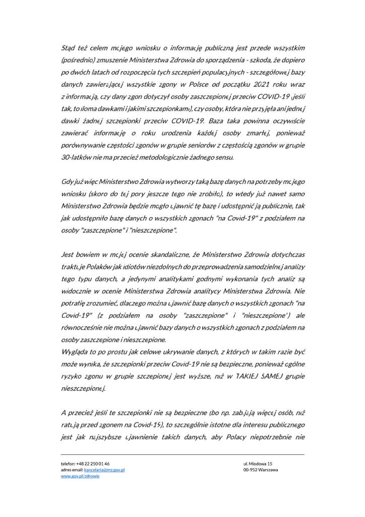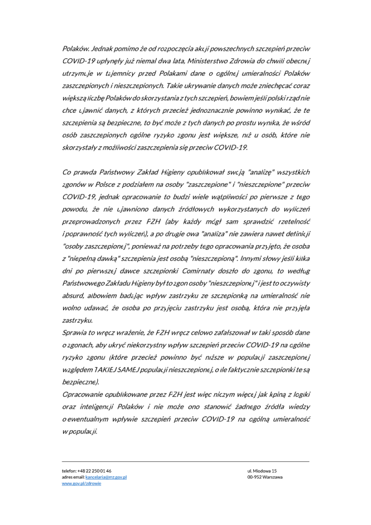 “Szczepieniom przeciw COVID-19 poddano już ponad 22 miliony Polaków. Jednak pomimo że od rozpoczęcia akcji powszechnych szczepień przeciw COVID-19 upłynęły już niemal dwa lata, Ministerstwo Zdrowia do chwili obecnej utrzymuje w tajemnicy przed Polakami dane o ogólnej umieralności Polaków zaszczepionych i nieszczepionych. Takie ukrywanie danych może zniechęcać coraz większą liczbę Polaków do skorzystania z tych szczepień, bowiem jeśli polski rząd nie chce ujawnić danych, z których przecież jednoznacznie powinno wynikać, że te szczepienia są bezpieczne, to być może z tych danych po prostu wynika, że wśród osób zaszczepionych ogólne ryzyko zgonu jest większe, niż u osób, które nie